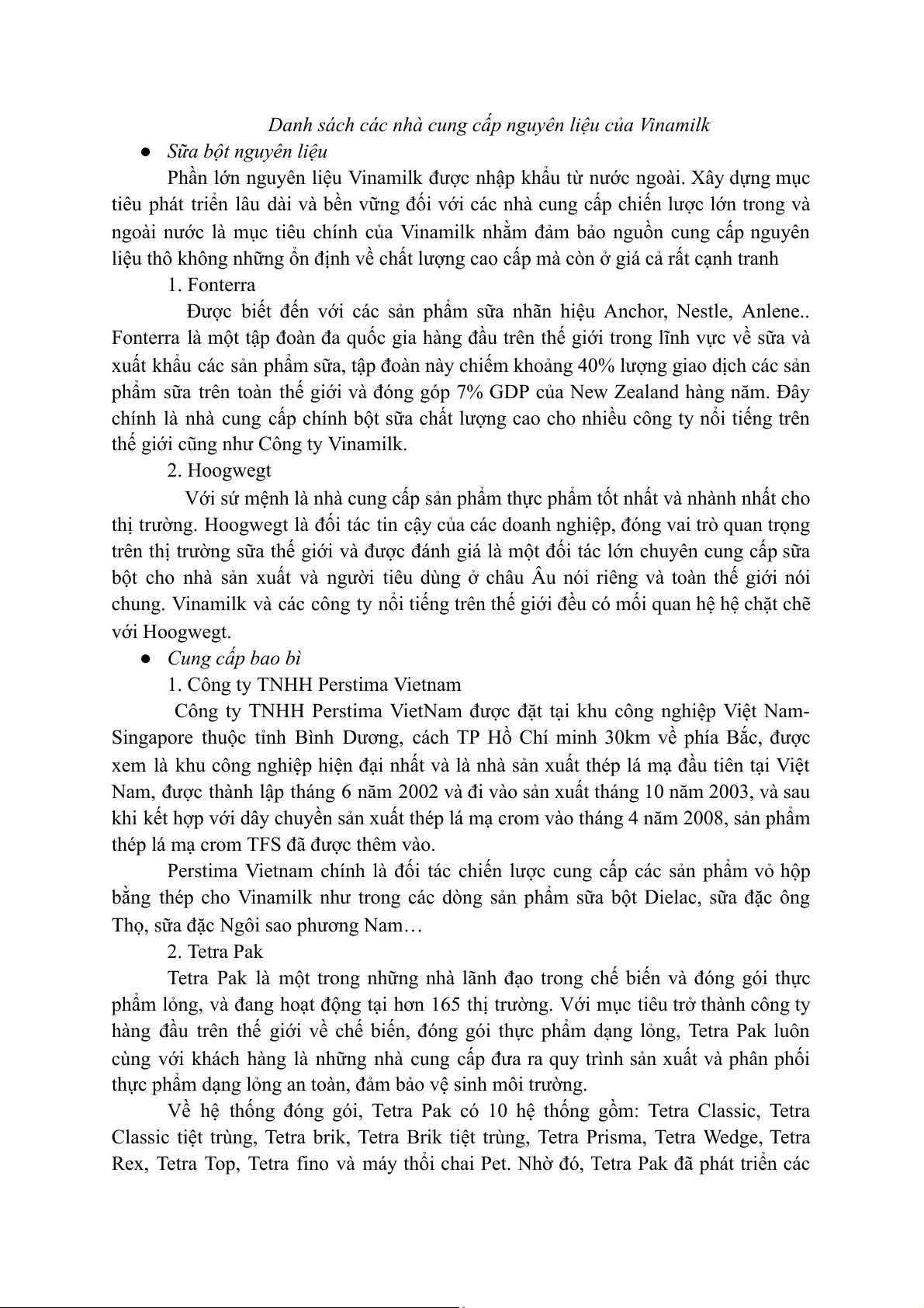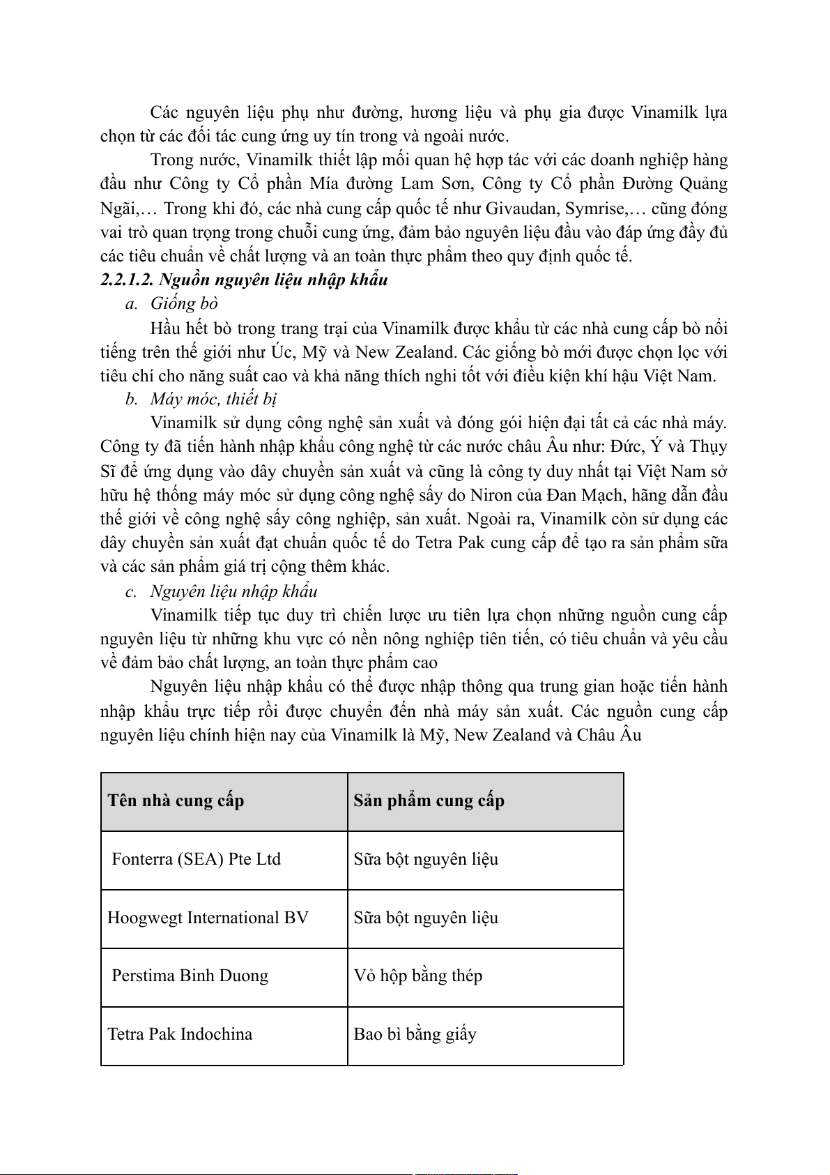 nguyên liệu chính hiện nay của Vinamilk là Mỹ, New Zealand và Châu Âu Tên nhà cung cấp Sản phẩm cung cấp Fonterra (SEA) Pte Ltd Sữa bột nguyên liệu Hoogwegt International BV Sữa bột nguyên liệu Perstima Binh Duong Vỏ hộp bằng thép Tetra Pak Indochina Bao bì bằng giấy