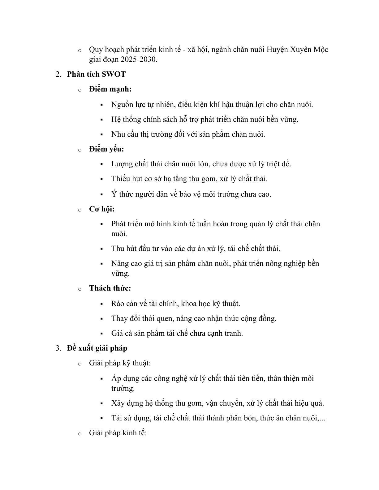 Quyhoạchpháttriểnkinhtế-xãhội,ngànhchănnuôiHuyệnXuyênMộc giaiđoạn2025-2030. 2. Phân tích SWOT o Điểm mạnh: