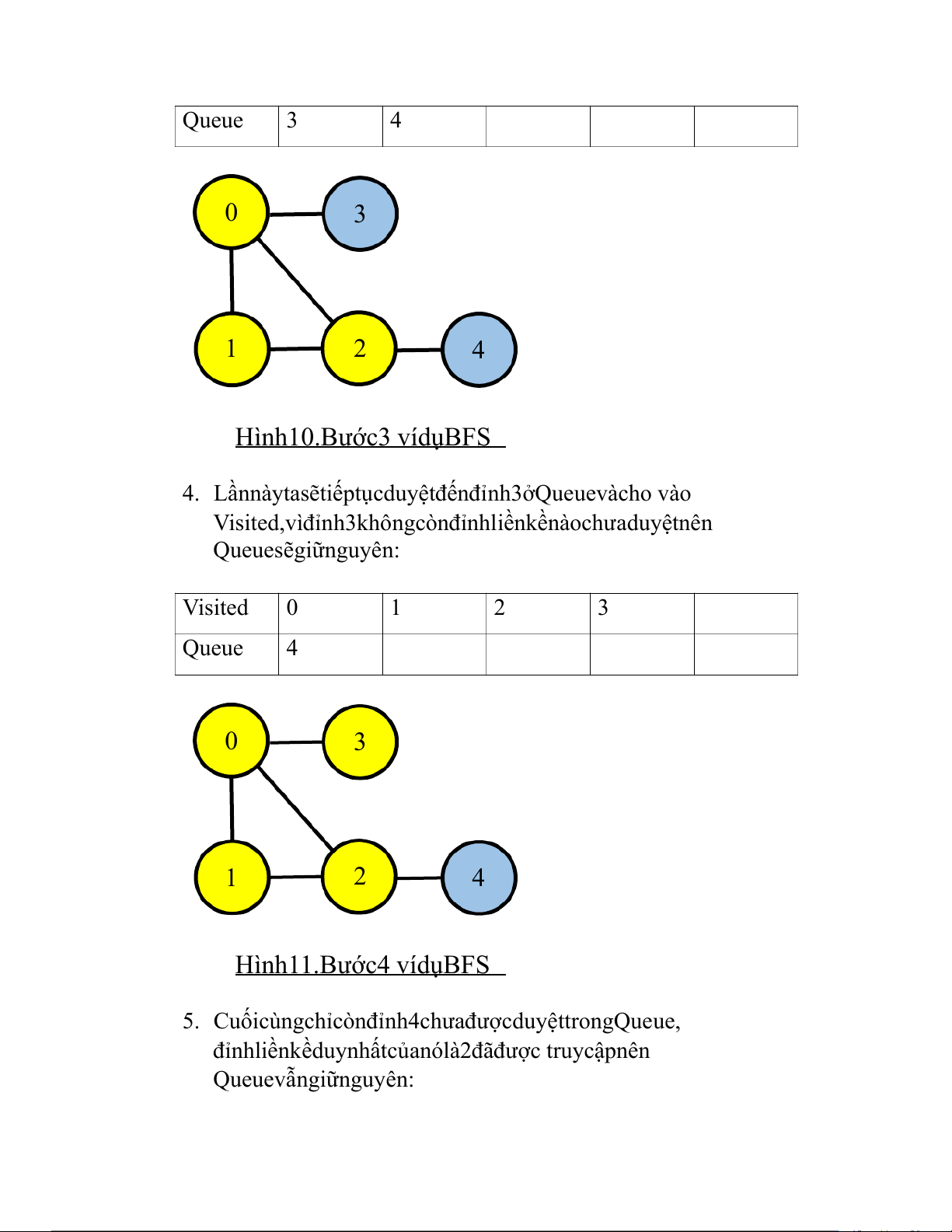 Visited,vìđỉnh3khôngcònđỉnhliềnkềnàochưaduyệtnên Queuesẽgiữnguyên: Visited 0 1 2 3 Queue 4 0 3 1 2 4 Hình11.Bước4 vídụBFS
