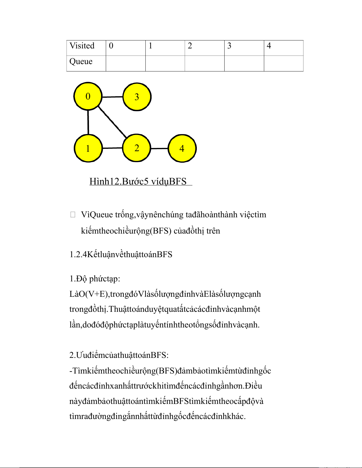 đỉnhliềnkềduynhấtcủanólà2đãđược truycậpnên Queuevẫngiữnguyên: Visited 0 1 2 3 4 Queue 0 3 1 2 4 Hình12.Bước5 vídụBFS