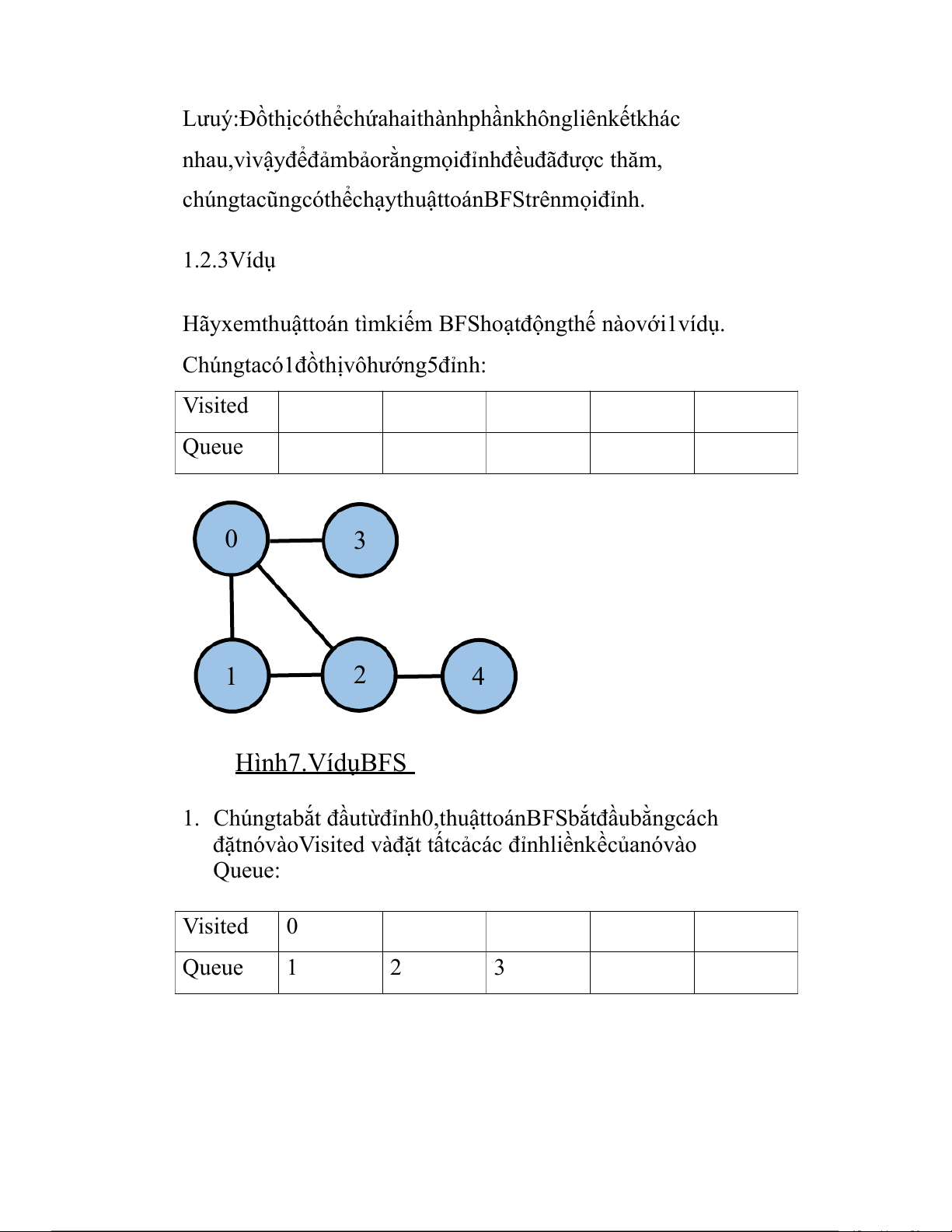 Chúngtacó1đồthịvôhướng5đỉnh: Visited Queue 0 3 1 2 4 Hình7.VídụBFS