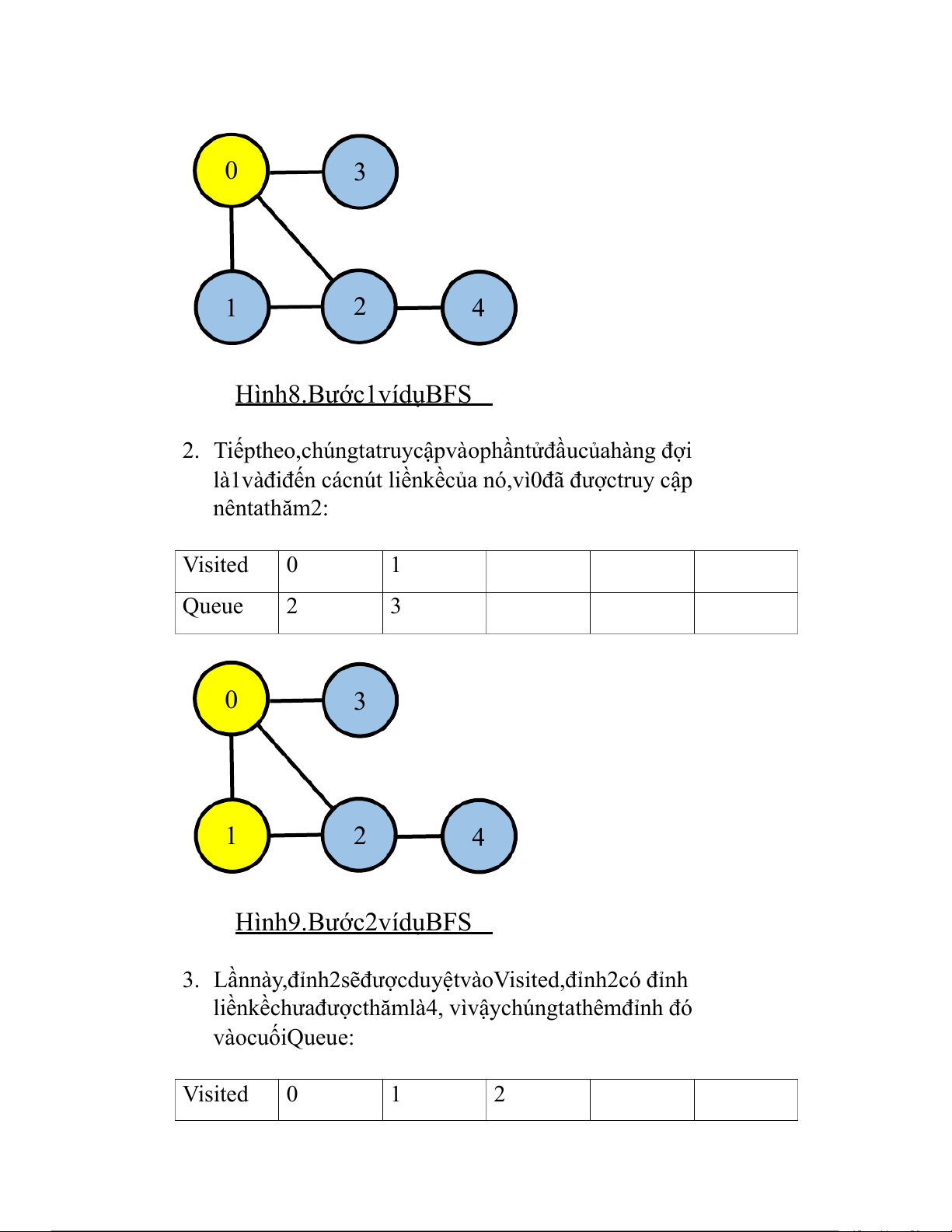là1vàđiđến cácnút liềnkềcủa nó,vì0đã đượctruy cập nêntathăm2: Visited 0 1 Queue 2 3 0 3 1 2 4 Hình9.Bước2vídụBFS