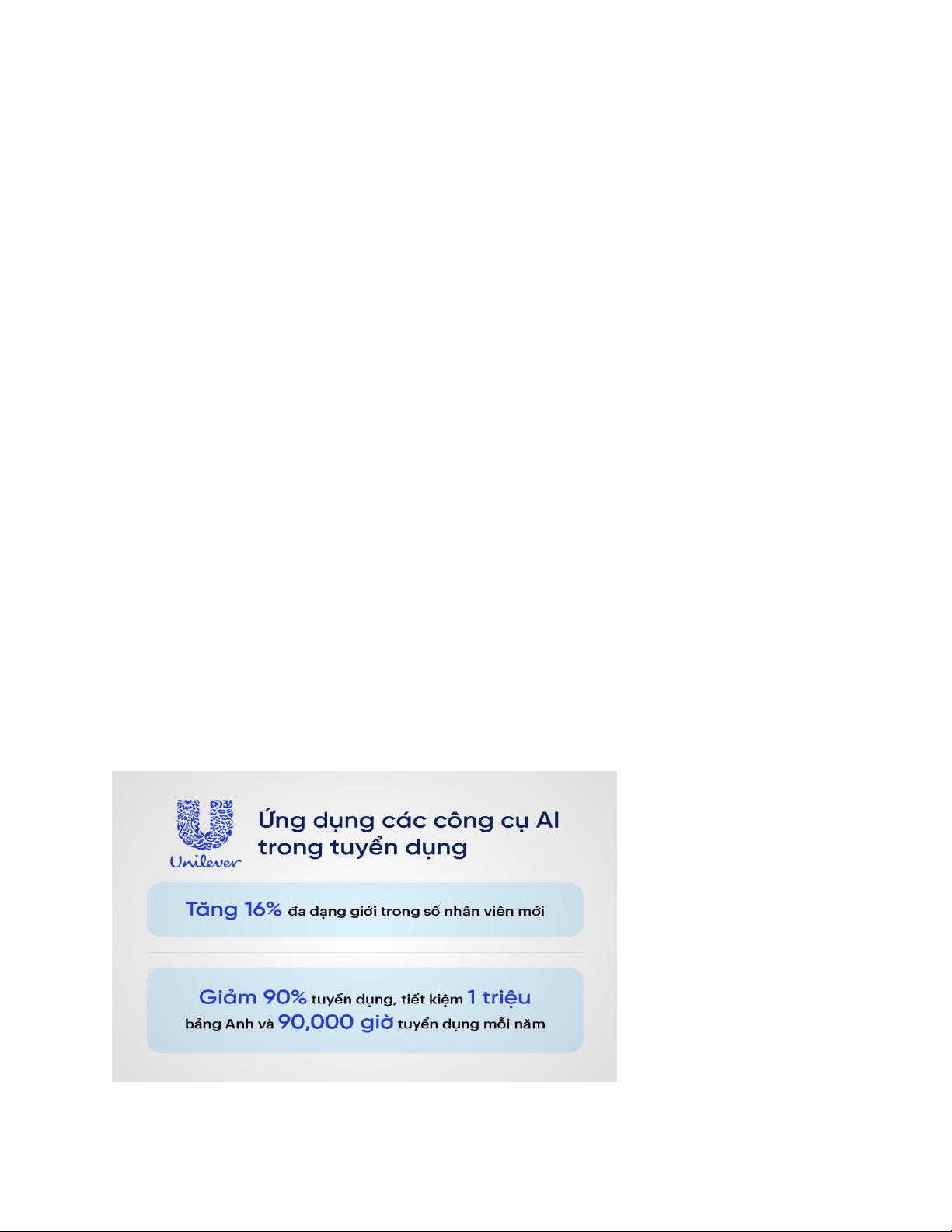 Unilever sử dụng AI trong quy trình tuyển dụng thông qua việc phân tích hồ sơ ứng viên và hành vi phỏng vấn trực tuyến. Hệ thống AI tự động sàng lọc CV dựa trên kỹ năng, kinh nghiệm và mức độ phù hợp với vị trí, giúp giảm thời gian tuyển dụng và hạn chế yếu tố cảm tính của con người. Ngoài ra, AI còn phân tích kết quả làm việc của nhân viên để đề xuất các chương trình đào tạo cá nhân hóa, phù hợp với năng lực và định hướng phát triển của từng cá nhân.
