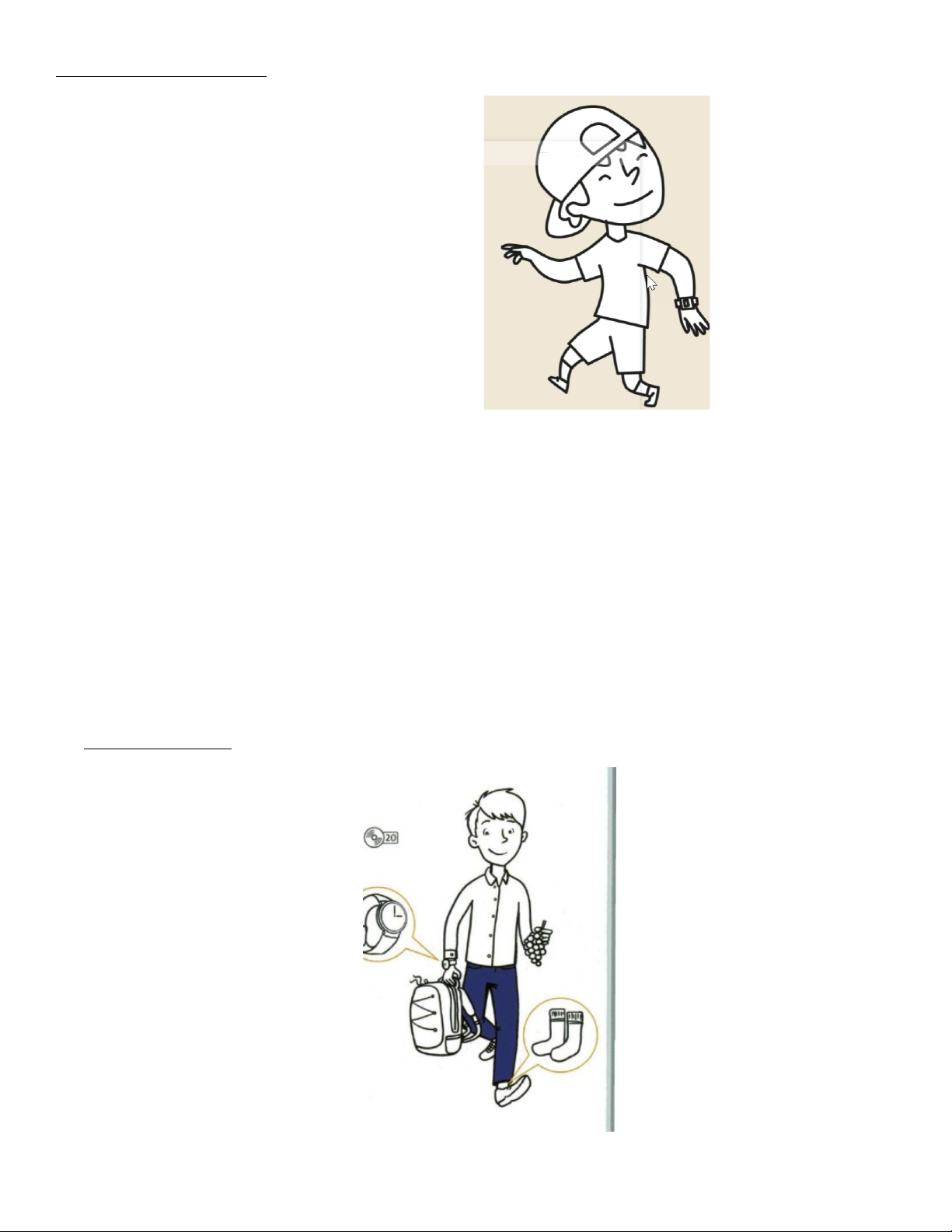 Hello! My name is Mark. I am 6 years old. I am wearing a white t-shirt. I am wearing black shorts. I am wearing blue socks. I am wearing white trainers. I am wearing a black cap. I am wearing a watch. Bye, bye. |