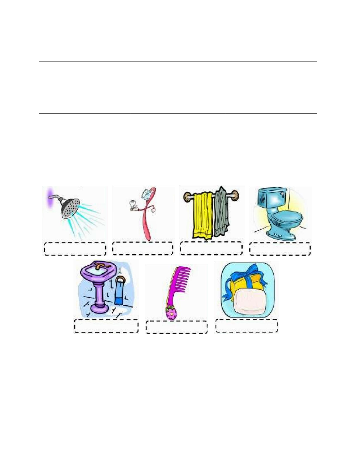 Are the buckets in the bush? Yes, they are/ No, they aren’t I. Vocabulary New words Transcription Meaning Comb /kə m/ʊ Lược Chải Counter / ka n.tər/ˈ ʊ Bệ rửa tay Shower / a ər/ʃ ʊ Vòi sen Sink /s ŋk/ɪ Bồn rửa Soap /sə p/ʊ Xà bông tắm Toilet / t .lət/ˈ ɔɪ Phòng vệ sinh toothbrush / tu θ.br /ˈ ː ʌʃ Bàn chải đánh răng Towel /ta əl/ʊ Khăn tắm Bucket / b k. t/ˈ ʌ ɪ Gầu múc Bush /bʊʃ/ Bụi cây Porch /p t /ɔː ʃ Hiên nhà Rope /rə p/ʊ Dây thừng Shovel /ˈʃʌv.əl/ Xẻng Swing /sw ŋ/ɪ Xích đu Set /set/ Bộ yard /jɑːd/ sân Ex 1: Write Soap comb towel toilet shower sink toothbrush Ex 2: Unscramble 1. sink/is/the/in/The soap