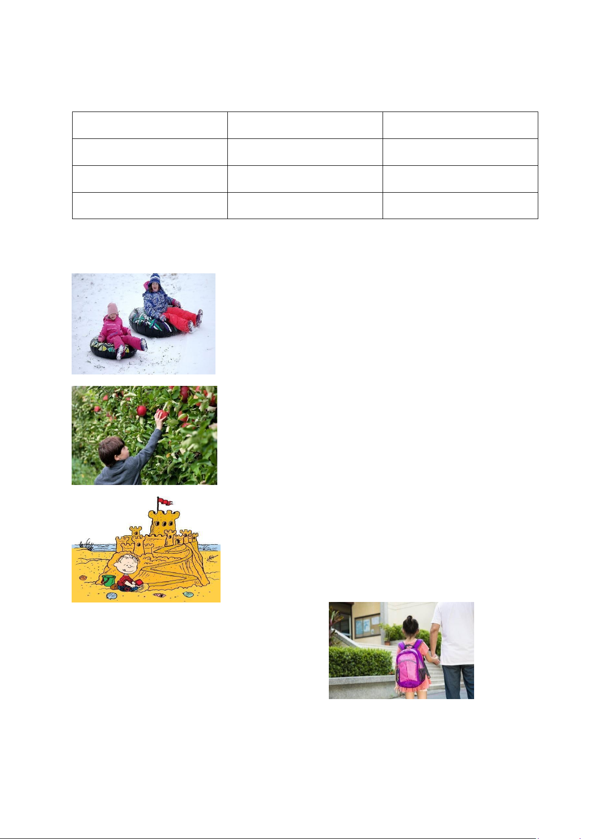 /meɪk/ ə/ /ˈsændˌkɑː.səl/ Làm lâu đài cát Make a snowman /meɪk/ ə/ /ˈsnəʊ.mæn/ Làm người tuyết Pick apples /pɪk/ /pɪk/ Nhặt táo Plant flower /plɑːnt/ /flaʊər/ Trồng hoa Play baseball /pleɪ/ /ˈbeɪs.bɔːl/ Chơi bóng chày Play tennis /pleɪ/ /ˈten.ɪs/ Chơi tennis Rake leaves /reɪk/ /reɪk/ Nhặt lá II. Grammar