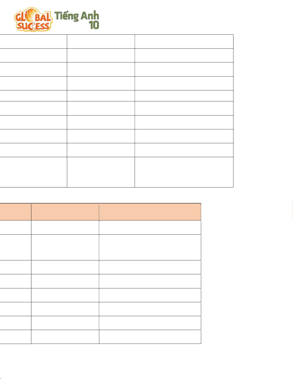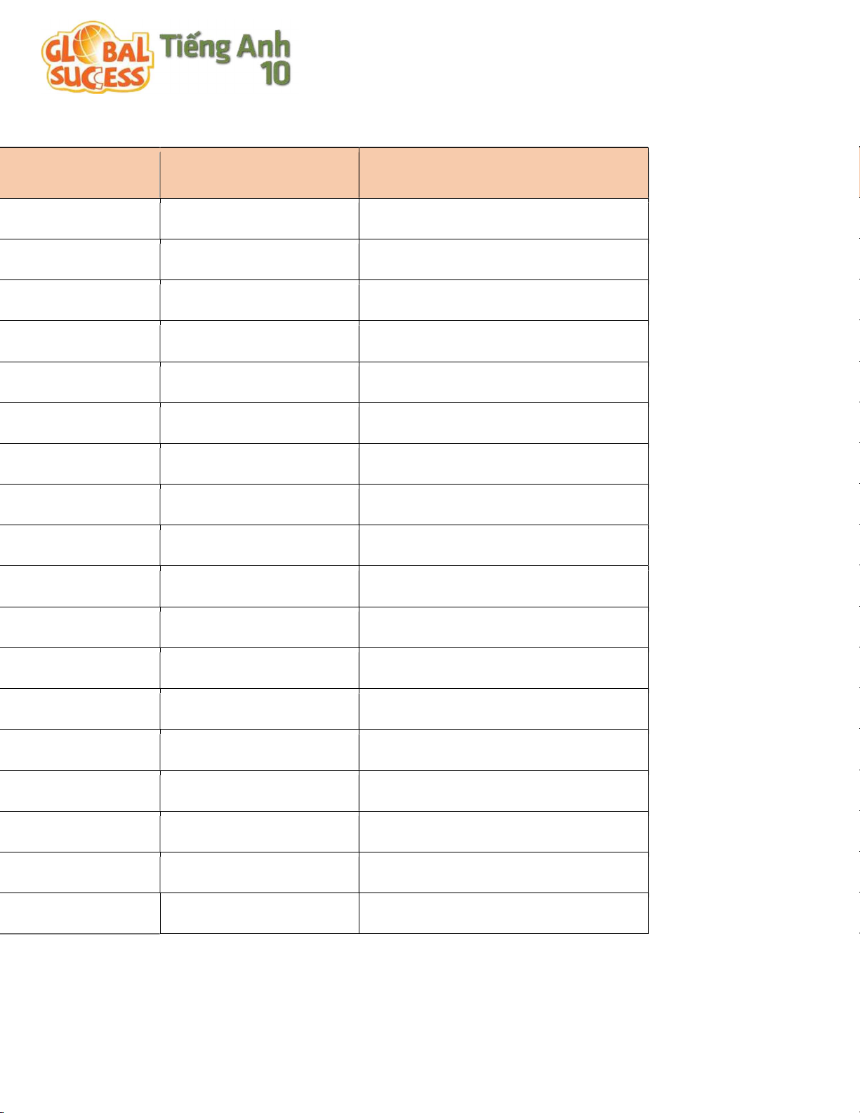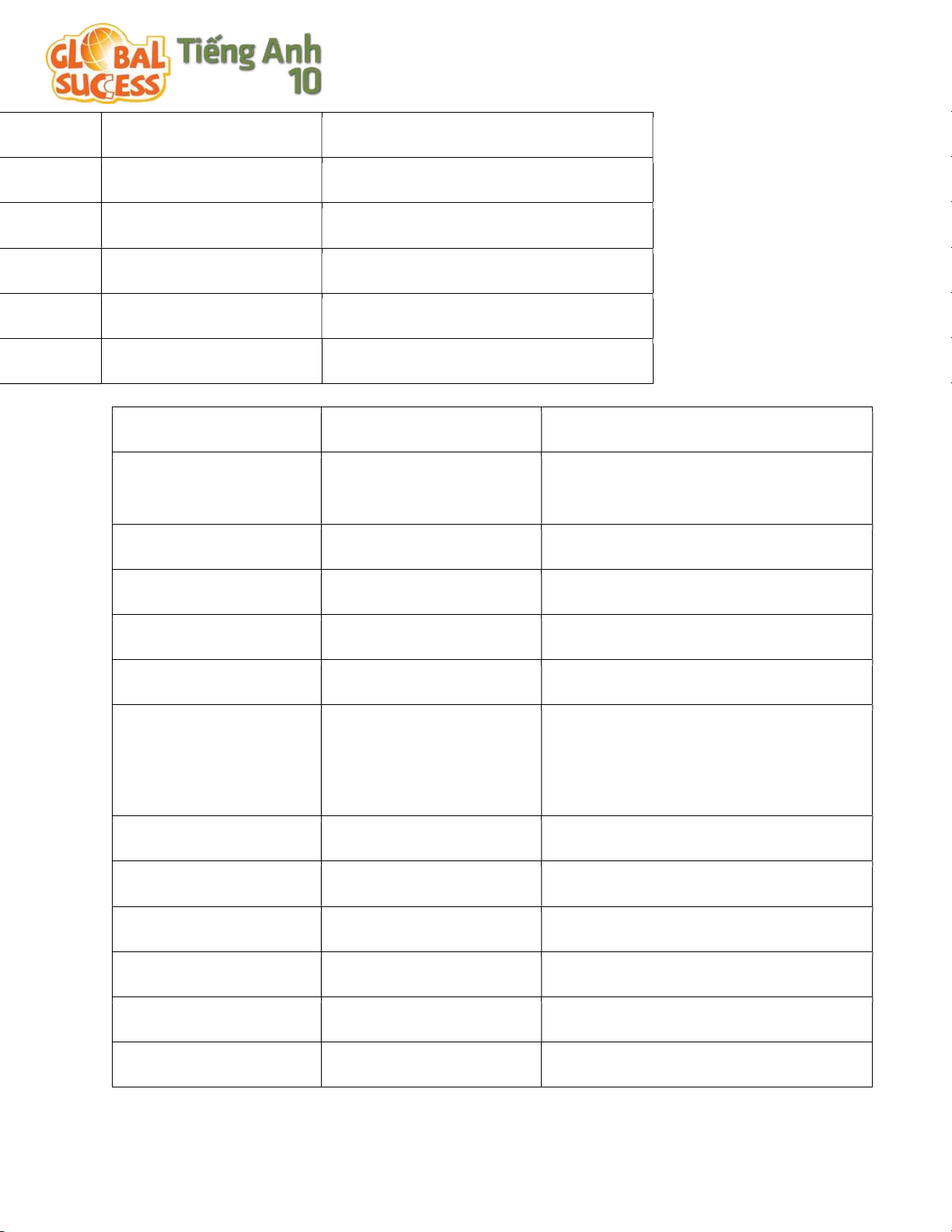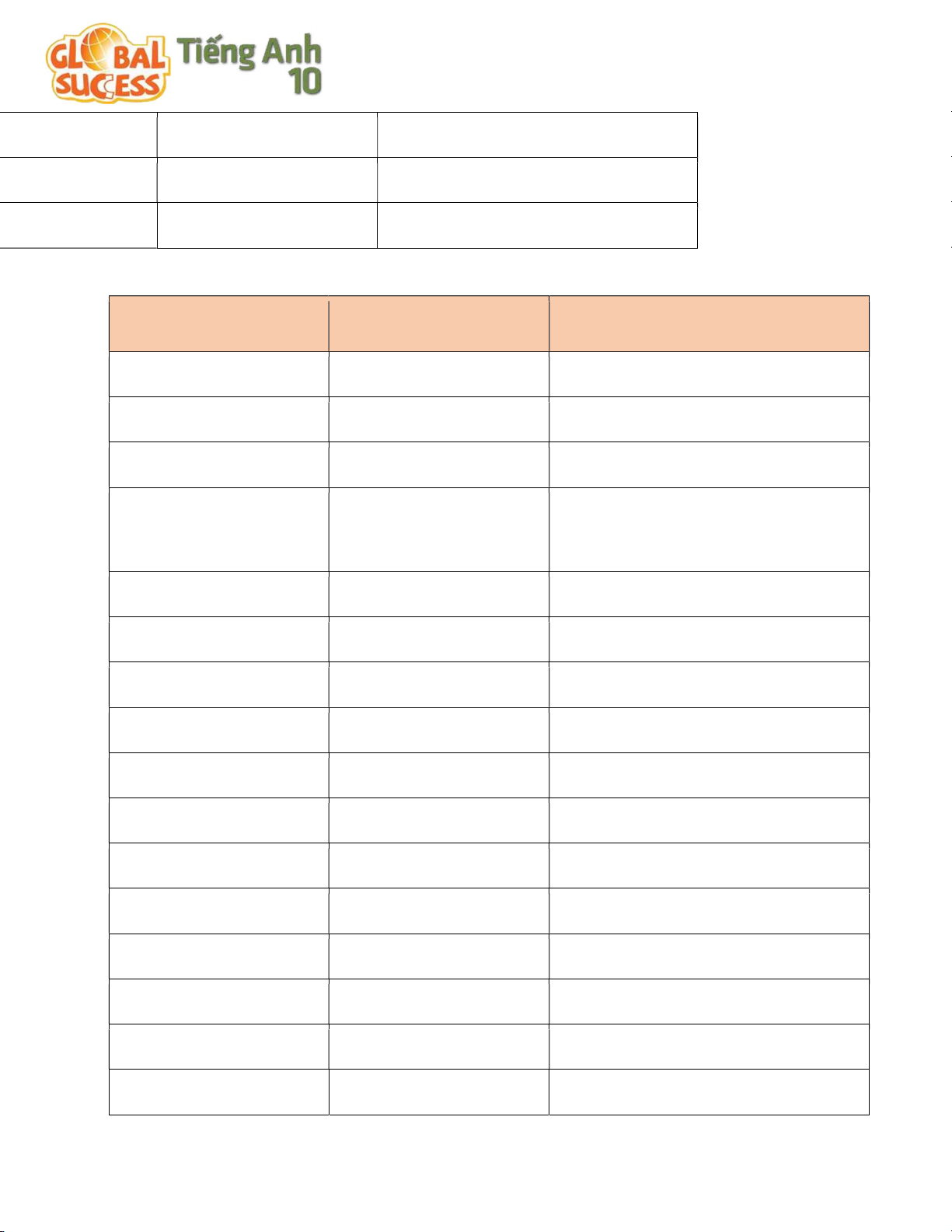 phương ện giao thông công cộng refil able (adj) /ˌriːˈfɪləbl/ có thể làm đầy lại resource (n) /rɪˈsɔːs/, /rɪˈzɔːs/ tài nguyên, nguồn lực sustainable (adj) /səˈsteɪnəbl/ bền vững Unit 3: Music PRONUNCIATION MEANING bamboo clapper (n) /ˌbæmˈbuː ˈklæpə/ phách /'kɒment/ lời bình luận /ˌkɒmpəˈtɪʃn/ cuộc tranh tài, cuộc thi /'kɒnsət/ buổi hoà nhạc /ˌdekəˈreɪʃn/ việc trang trí /dɪˈleɪ/ hoãn lại /ɪˈlɪmɪneɪt/ loại ra, loại trừ /dʒʌdʒ/ giám khảo /laɪv/ trực ếp /ləʊˈkeɪʃn/ vị trí, địa điểm shaped lute /ˈmuːn ʃeɪpt luːt/ đàn nguyệt