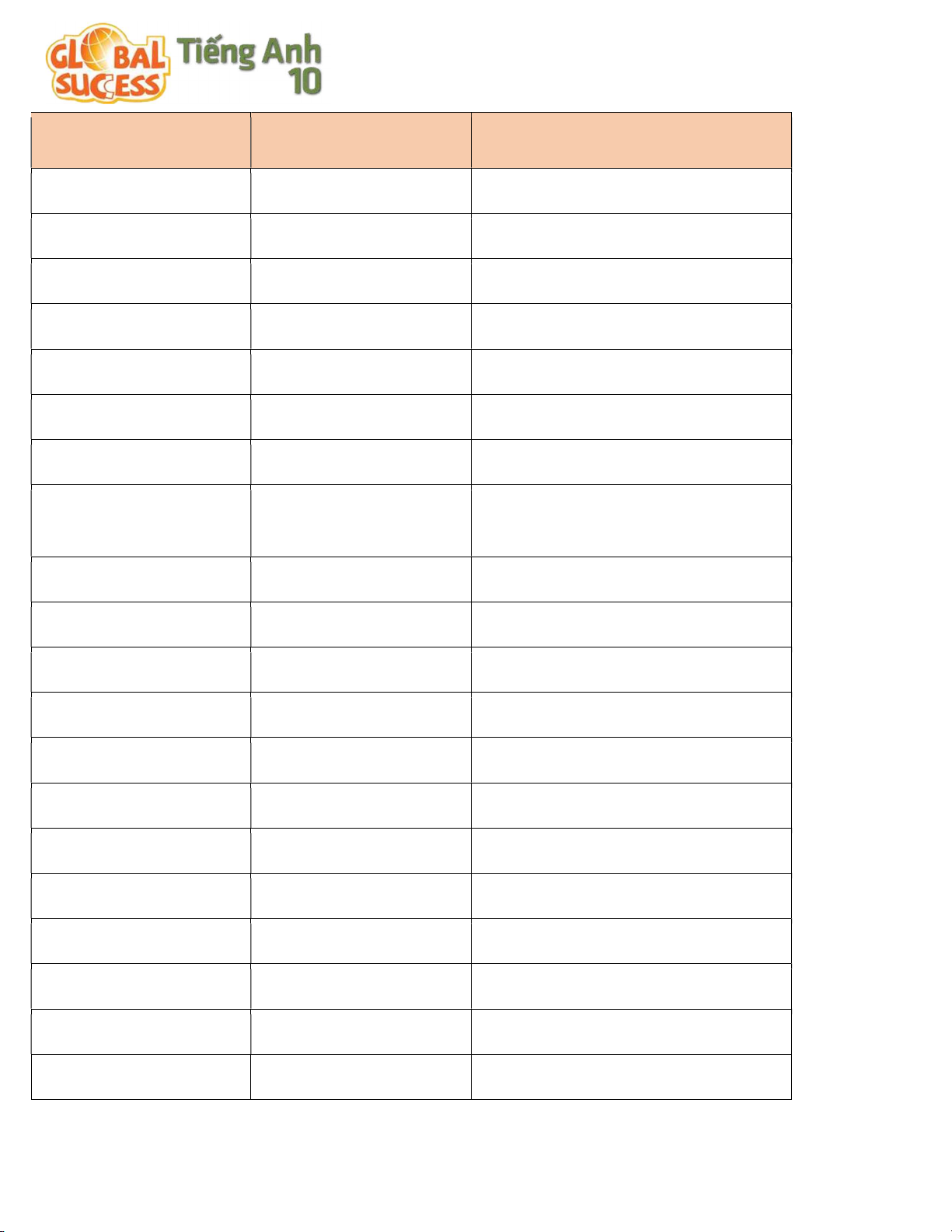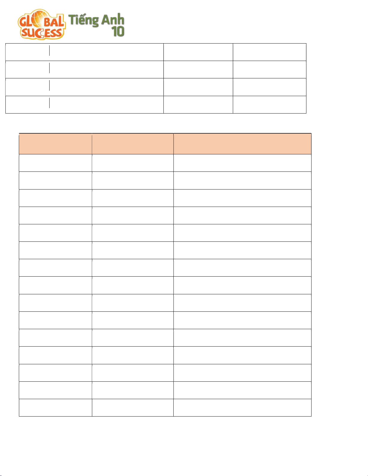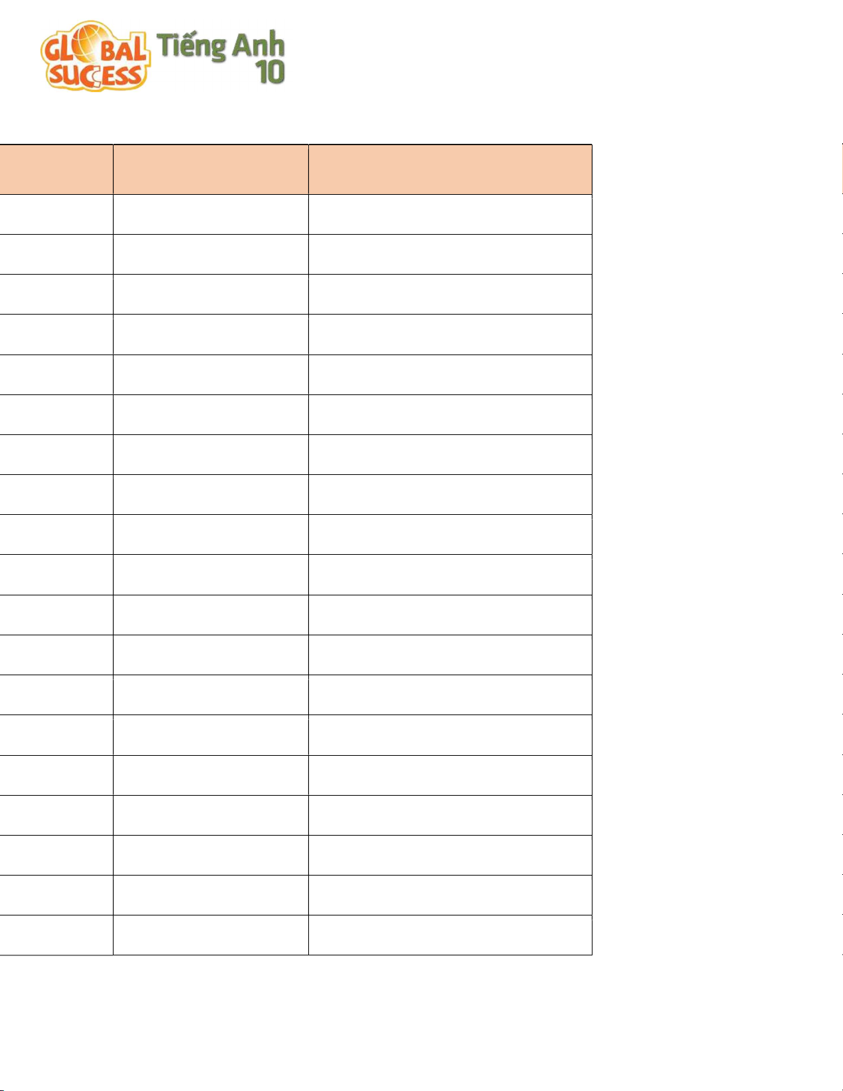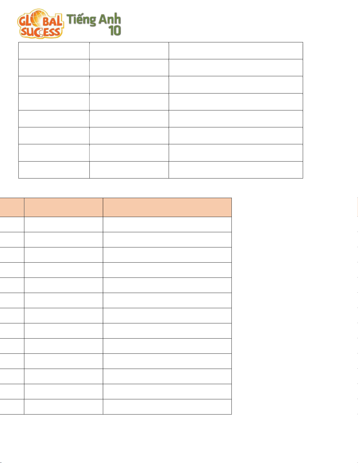 phương ện giao thông công cộng refil able (adj) /ˌriːˈfɪləbl/ có thể làm đầy lại resource (n) /rɪˈsɔːs/, /rɪˈzɔːs/ tài nguyên, nguồn lực sustainable (adj) /səˈsteɪnəbl/ bền vững Unit 3: Music PRONUNCIATION MEANING bamboo clapper (n) /ˌbæmˈbuː ˈklæpə/ phách /'kɒment/ lời bình luận /ˌkɒmpəˈtɪʃn/ cuộc tranh tài, cuộc thi /'kɒnsət/ buổi hoà nhạc /ˌdekəˈreɪʃn/ việc trang trí /dɪˈleɪ/ hoãn lại /ɪˈlɪmɪneɪt/ loại ra, loại trừ /dʒʌdʒ/ giám khảo /laɪv/ trực ếp /ləʊˈkeɪʃn/ vị trí, địa điểm shaped lute /ˈmuːn ʃeɪpt luːt/ đàn nguyệt