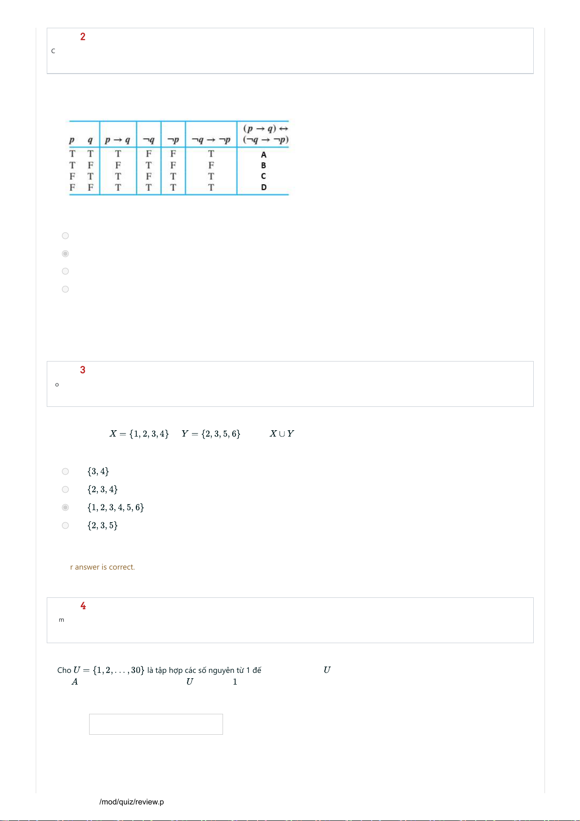 trong đó ¬p là phủ định của mệnh đề p. Khi đó, A. A= T; B=F; C=F; D=F. B. A= T; B=T; C=T; D=T. C. A= T; B=T; C=F; D=F. D. A= F; B=F; C=T; D=T. Your answer is correct. Question 3 Complete Mark 1.00 out of 1.00