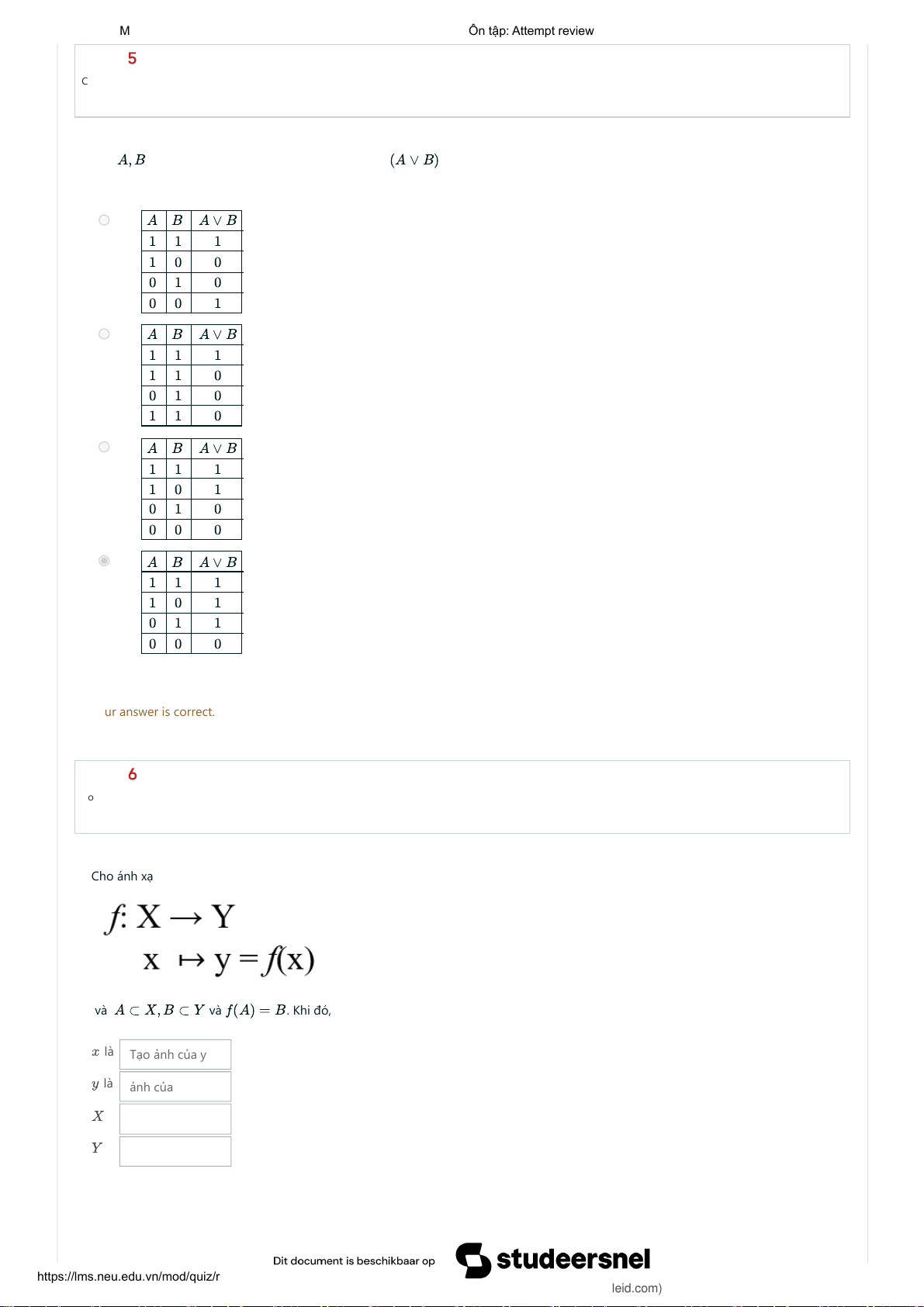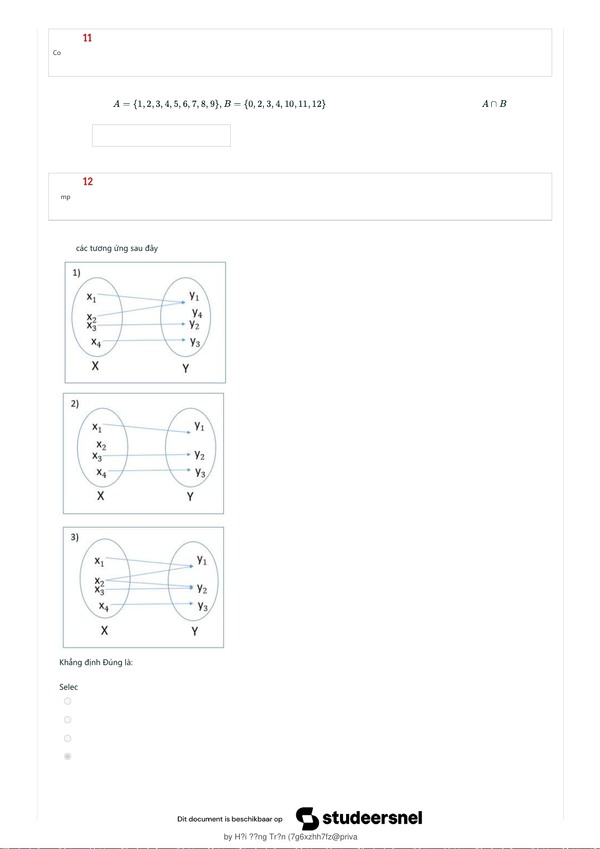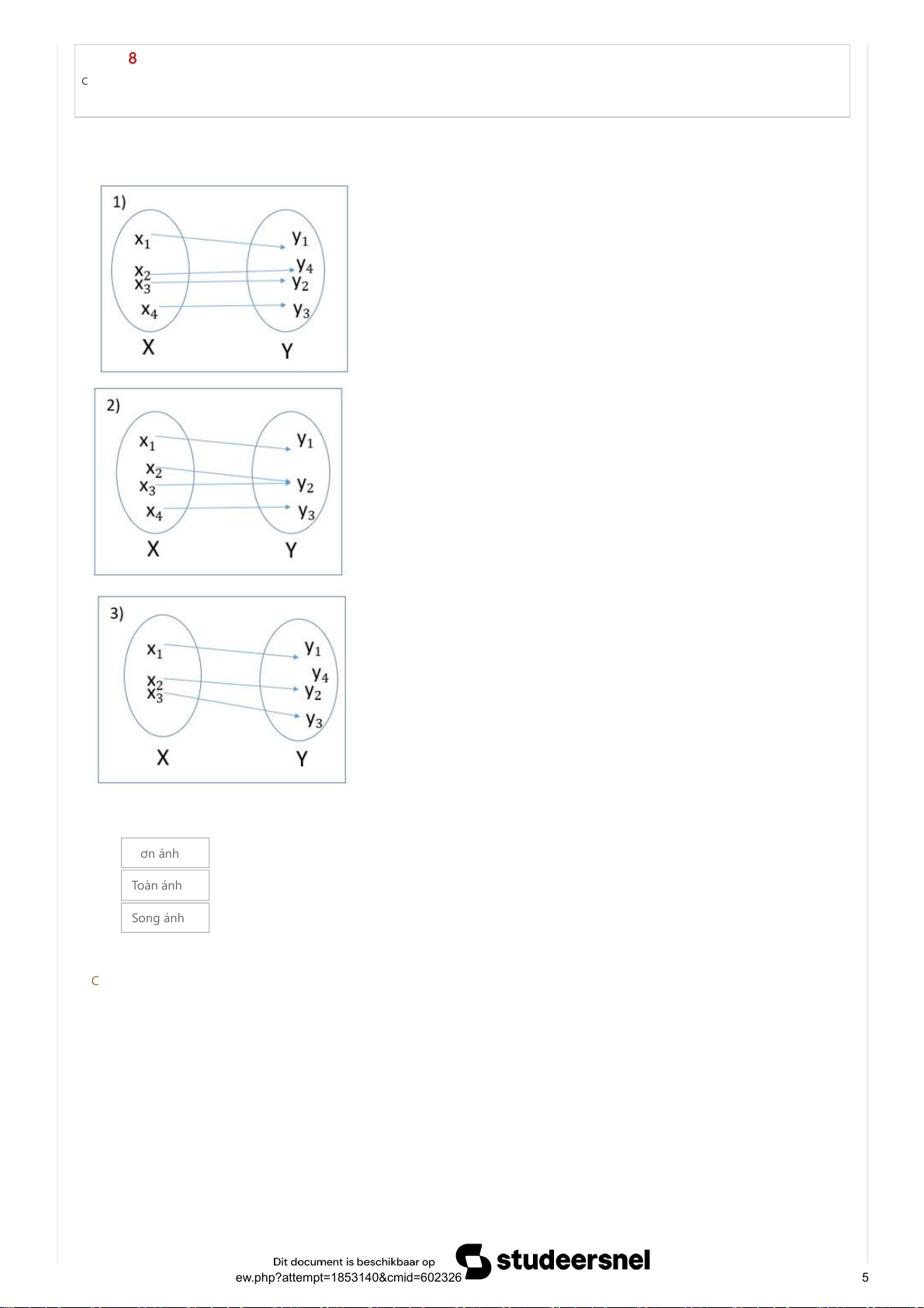 Downloaded by H?i ??ng Tr?n (7g6xzhh7fz@privaterelay.appleid.com) lOMoARcPSD|60562346 1/5/25, 11:18 AM Ôn tập: Attempt review Question 8 Complete Mark 1.00 out of 1.00 Cho các ánh xạ Khi đó, 3) là Đơn ánh 2) là Toàn ánh 1) là Song ánh