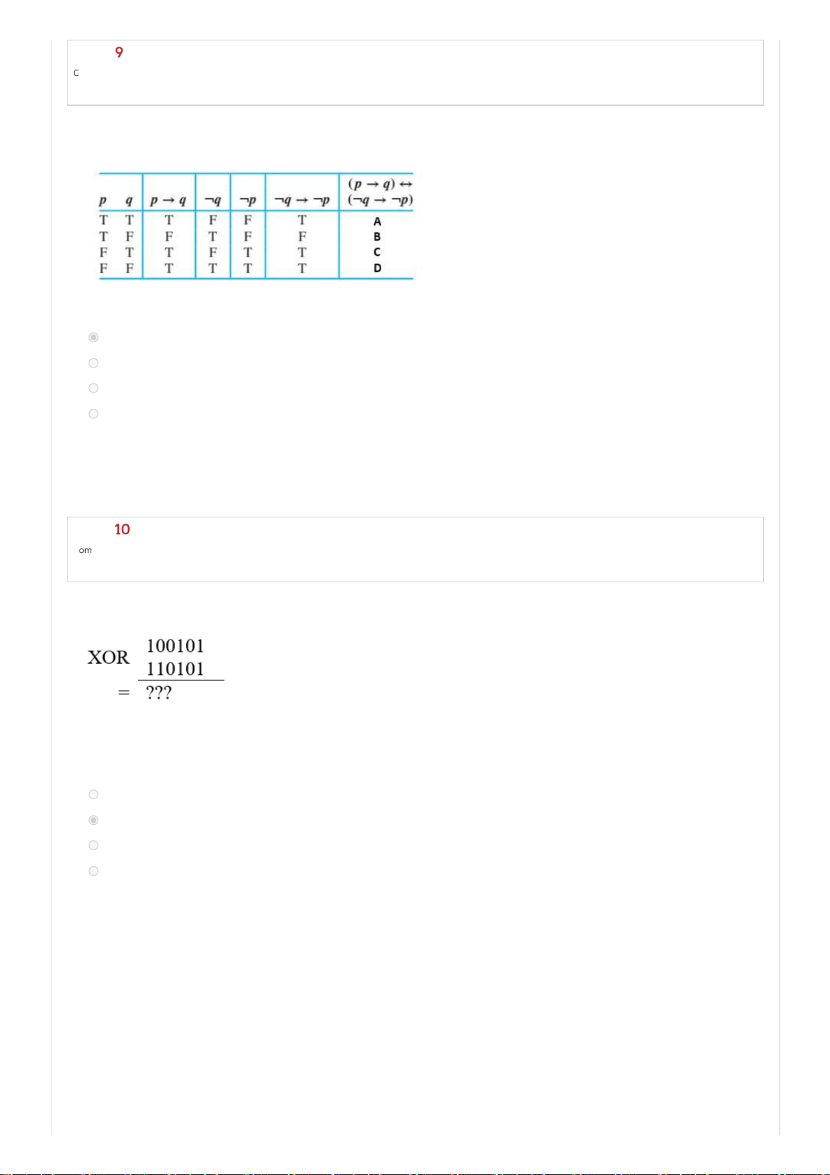 trong đó ¬p là phủ định của mệnh đề p. Khi đó, A. A= T; B=T; C=T; D=T. B. A= T; B=F; C=F; D=F. C. A= F; B=F; C=T; D=T. D. A= T; B=T; C=F; D=F. Your answer is correct. Question 10 Complete Mark 1.00 out of 1.00