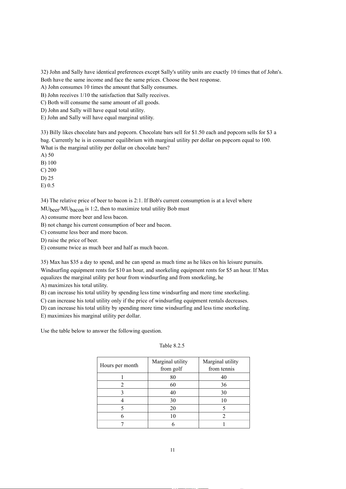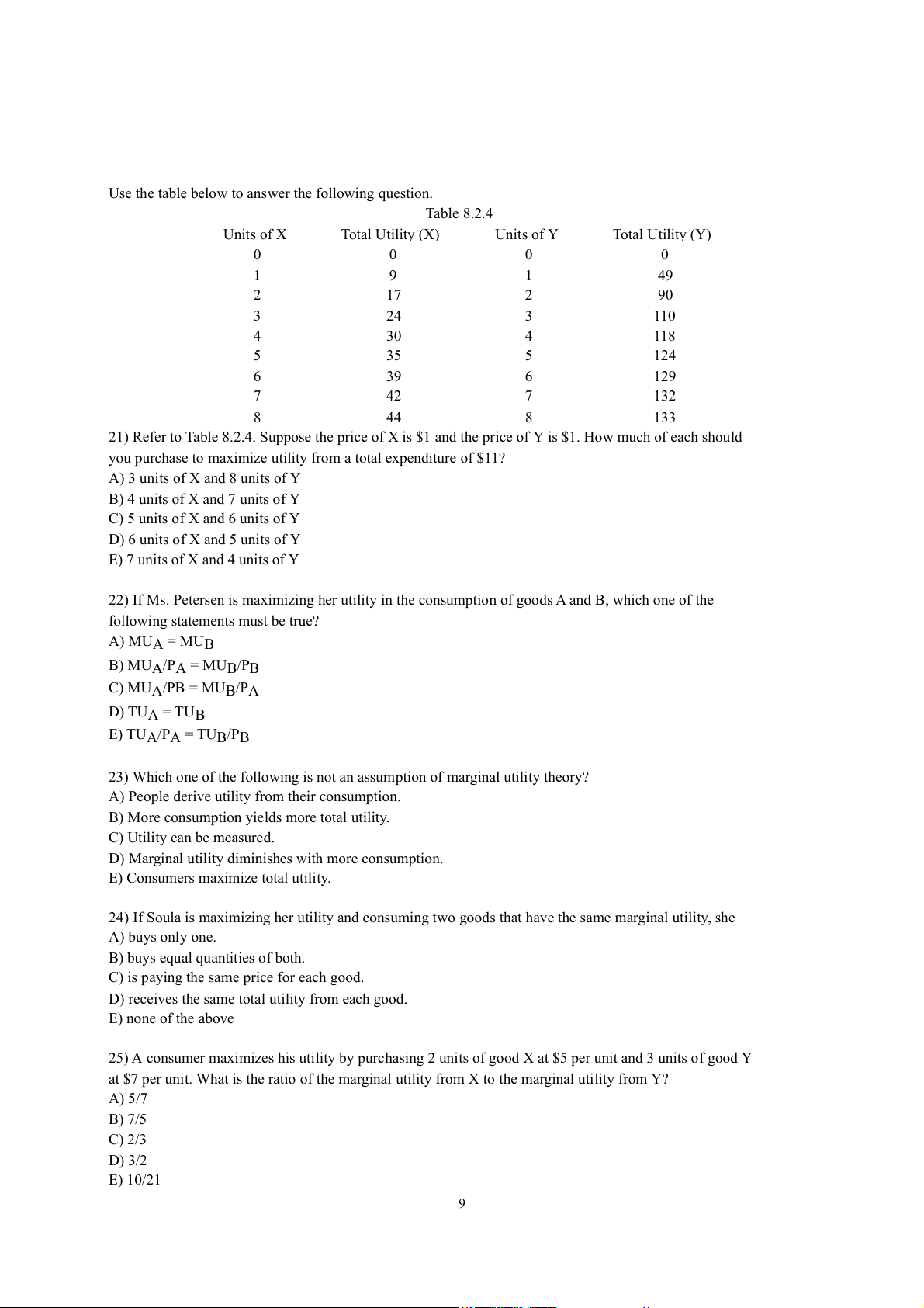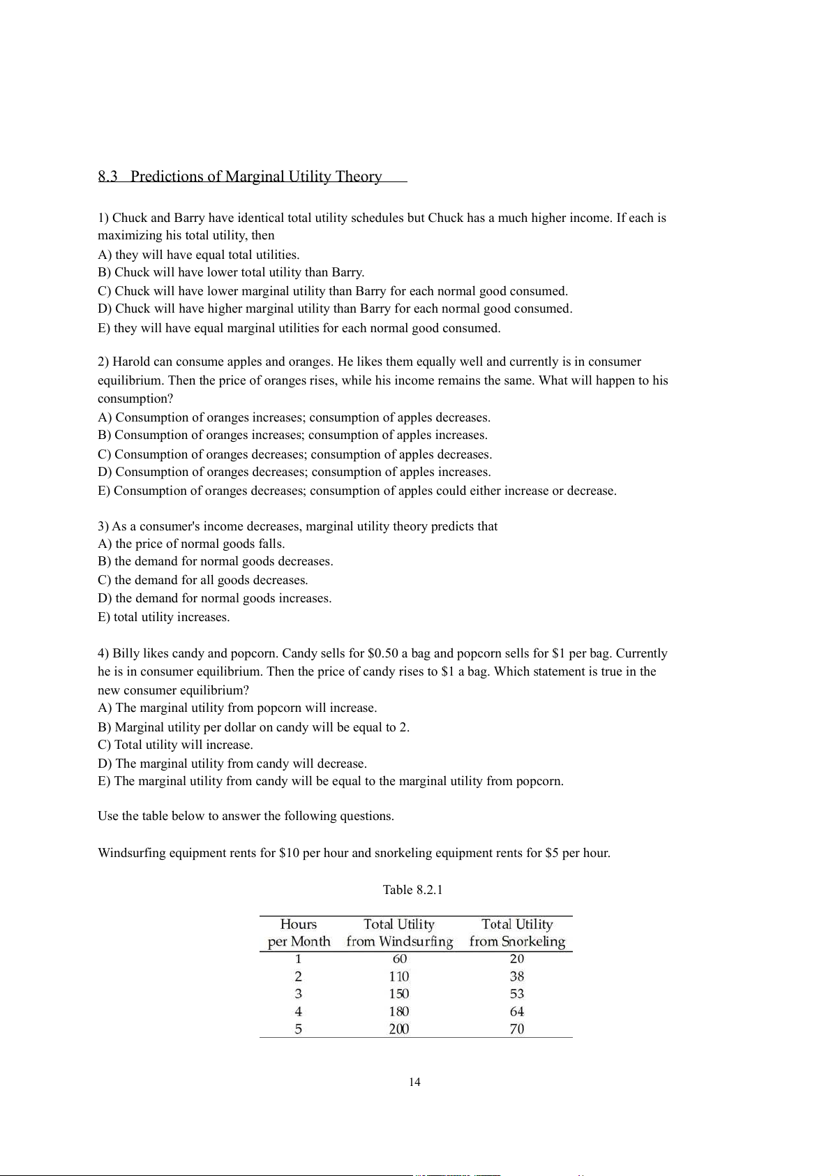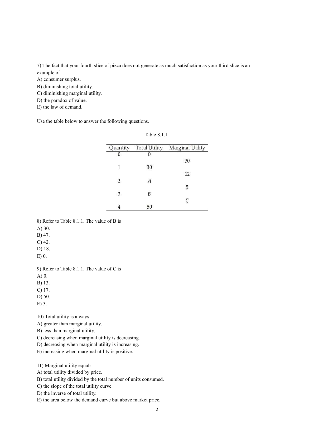 9) Refer to Table 8.1.1. The value of C is A) 0. B) 13. C) 17. D) 50. E) 3. 10) Total utility is always