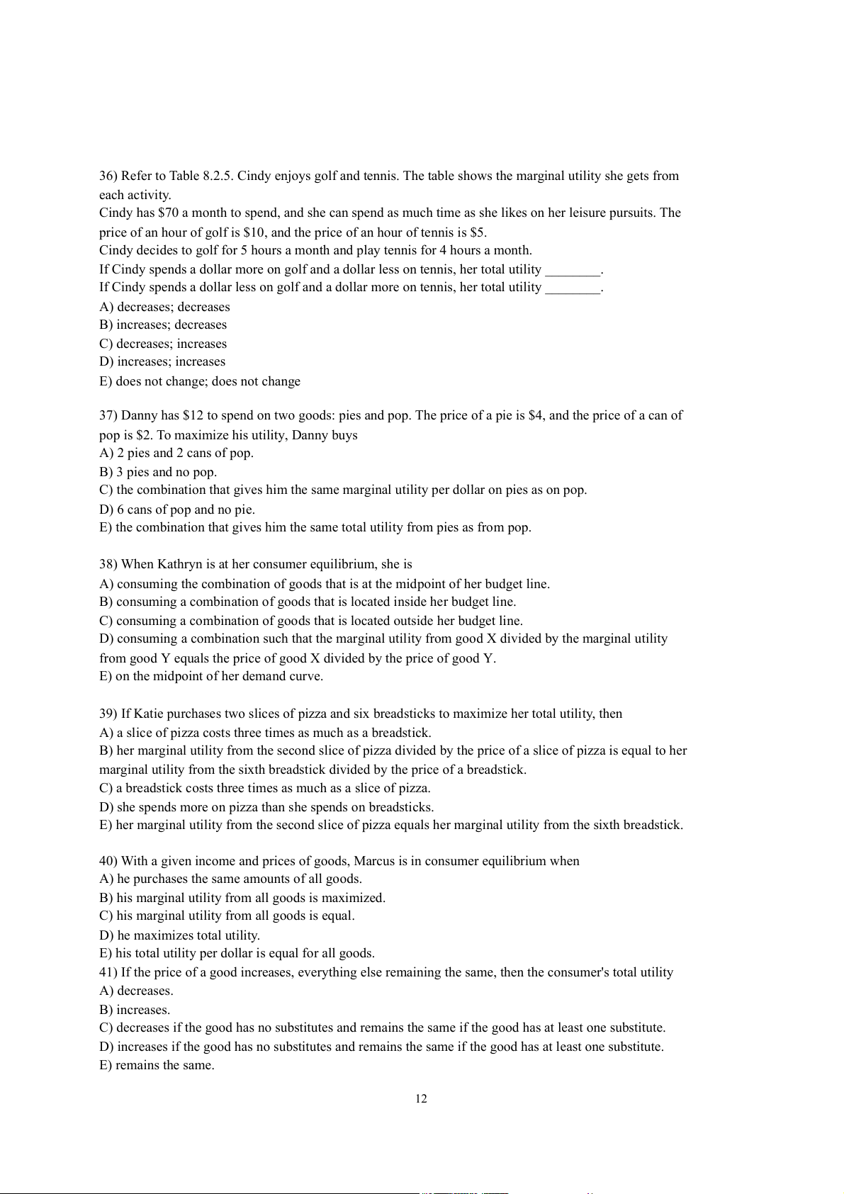 38) Marginal utility theory predicts that when a consumer's income decreases, the consumer A) buys fewer normal goods. B) buys more normal goods. C) buys fewer inferior goods. D) buys less of all goods. E) buys more of all goods.