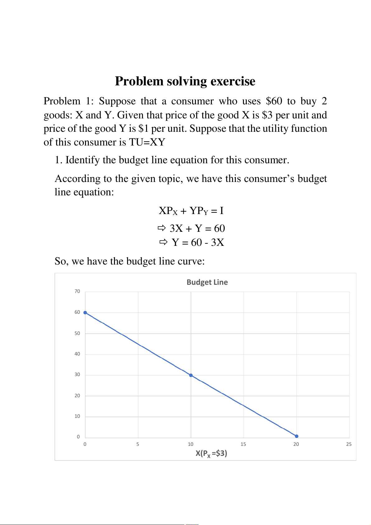 According to the given topic, we have this consumer’s budget line equation: XPX + YPY = I 3X + Y = 60 Y = 60 - 3X
