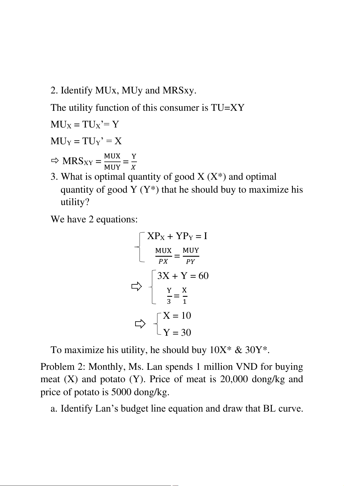 Lan’s utility function is TU = (X - 2)Y = XY – 2Y MUX = TUX’ = Y MUY = TUY’ = X – 2 We have 2 equations: XPX + YPY = I MUX = MUY PX PY 20,000X + 5000Y = 1,000,000 Y = X−2 20,000 5000 X = 26 Y = 96