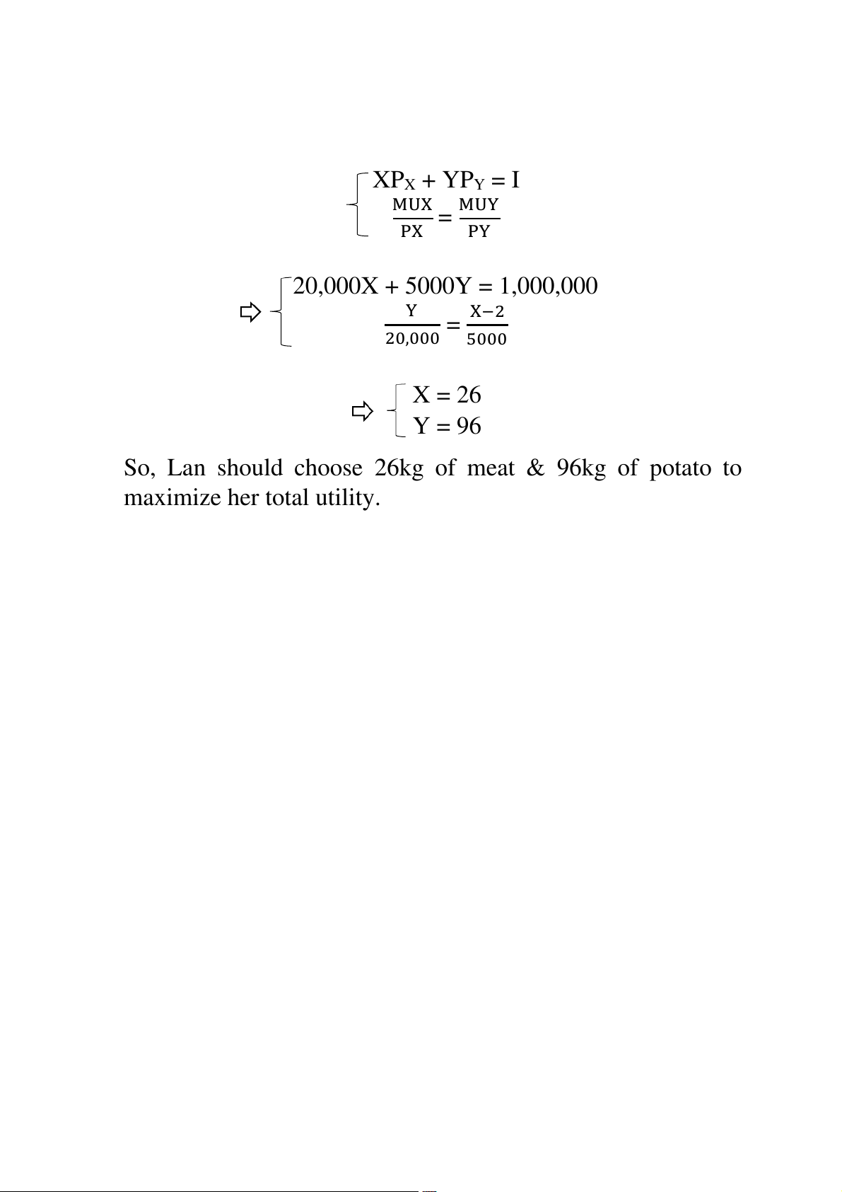 So, Lan should choose 26kg of meat & 96kg of potato to maximize her total utility.