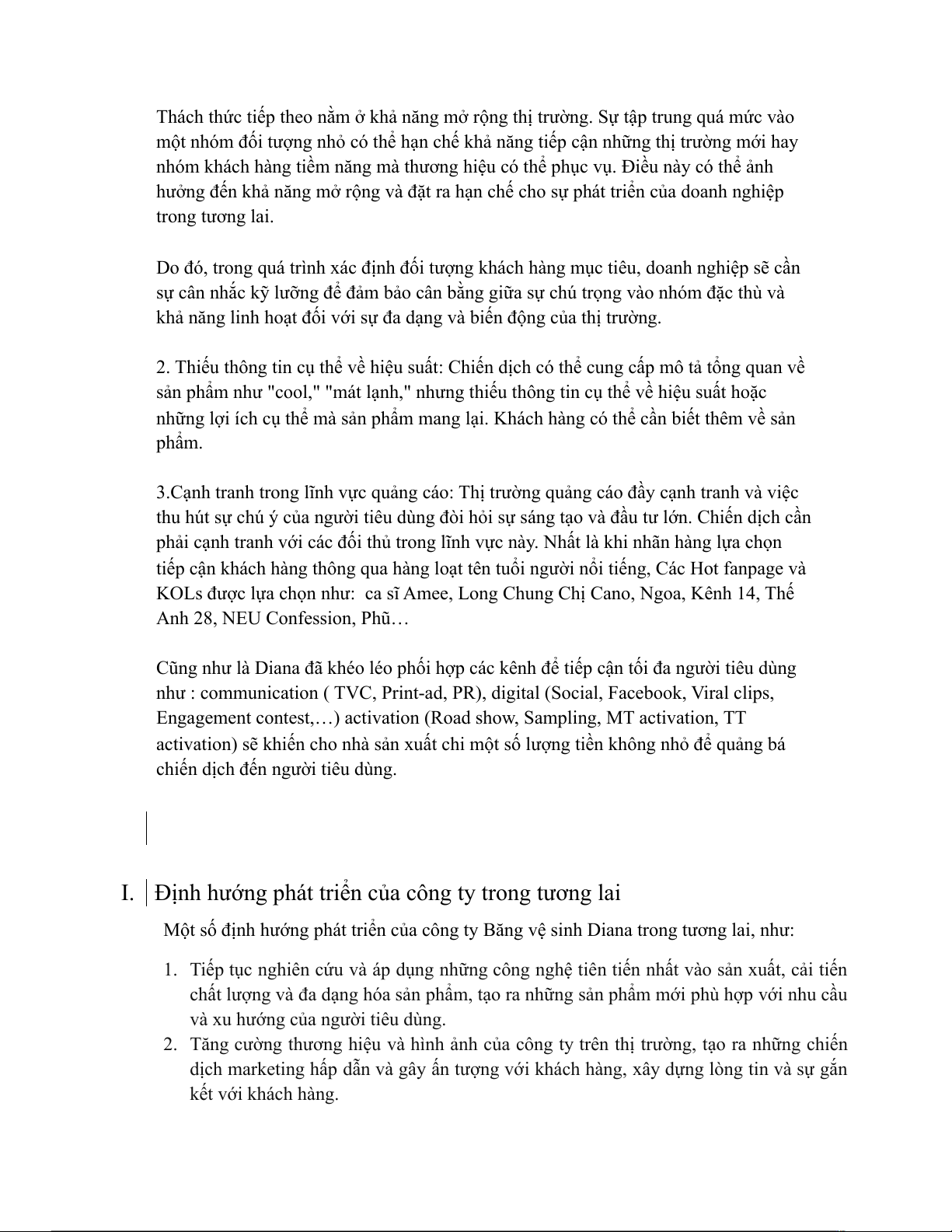 Một số định hướng phát triển của công ty Băng vệ sinh Diana trong tương lai, như: