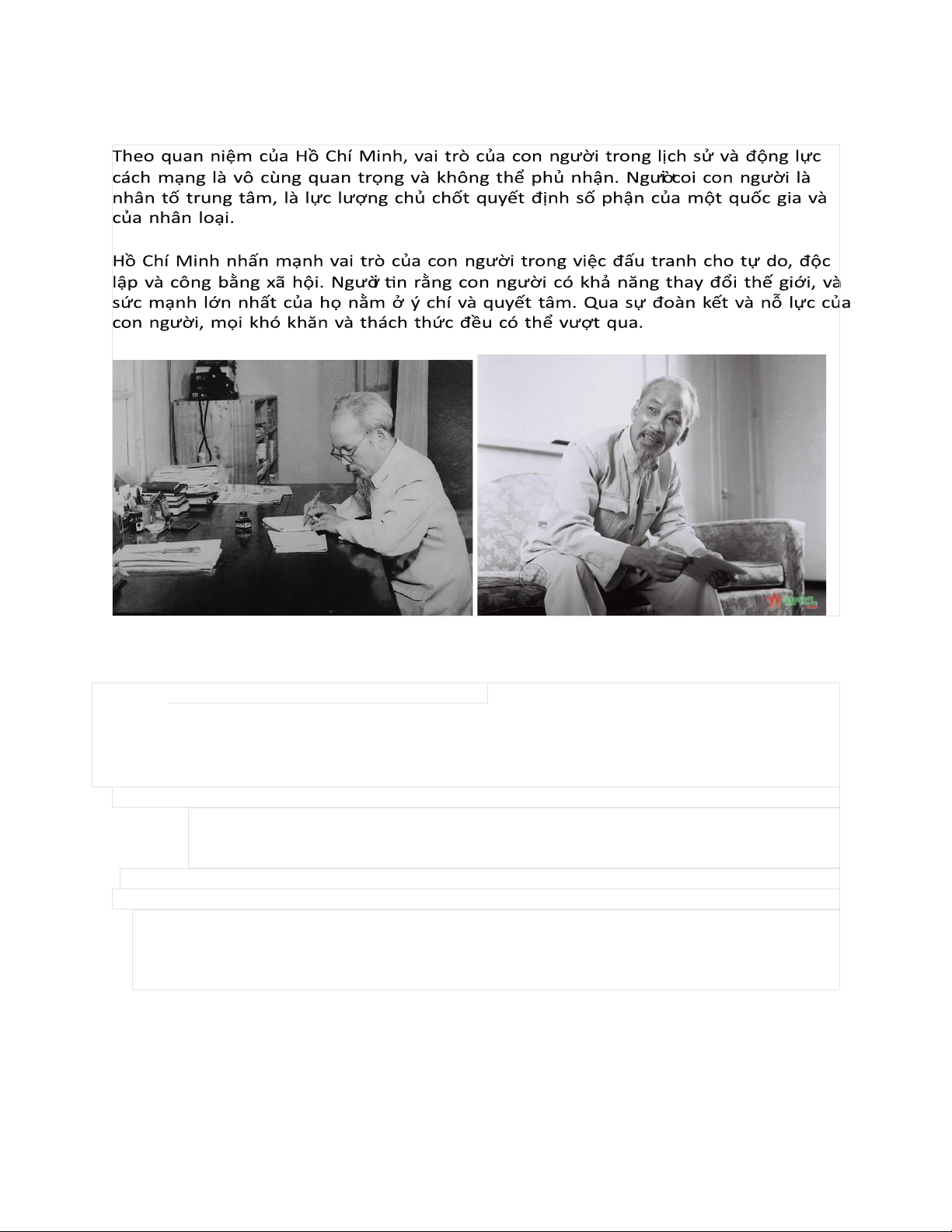 1. Nhân tố quyết định trong lịch sử: Theo Hồ Chí Minh, con người là nhân tố quyết định trong lịch