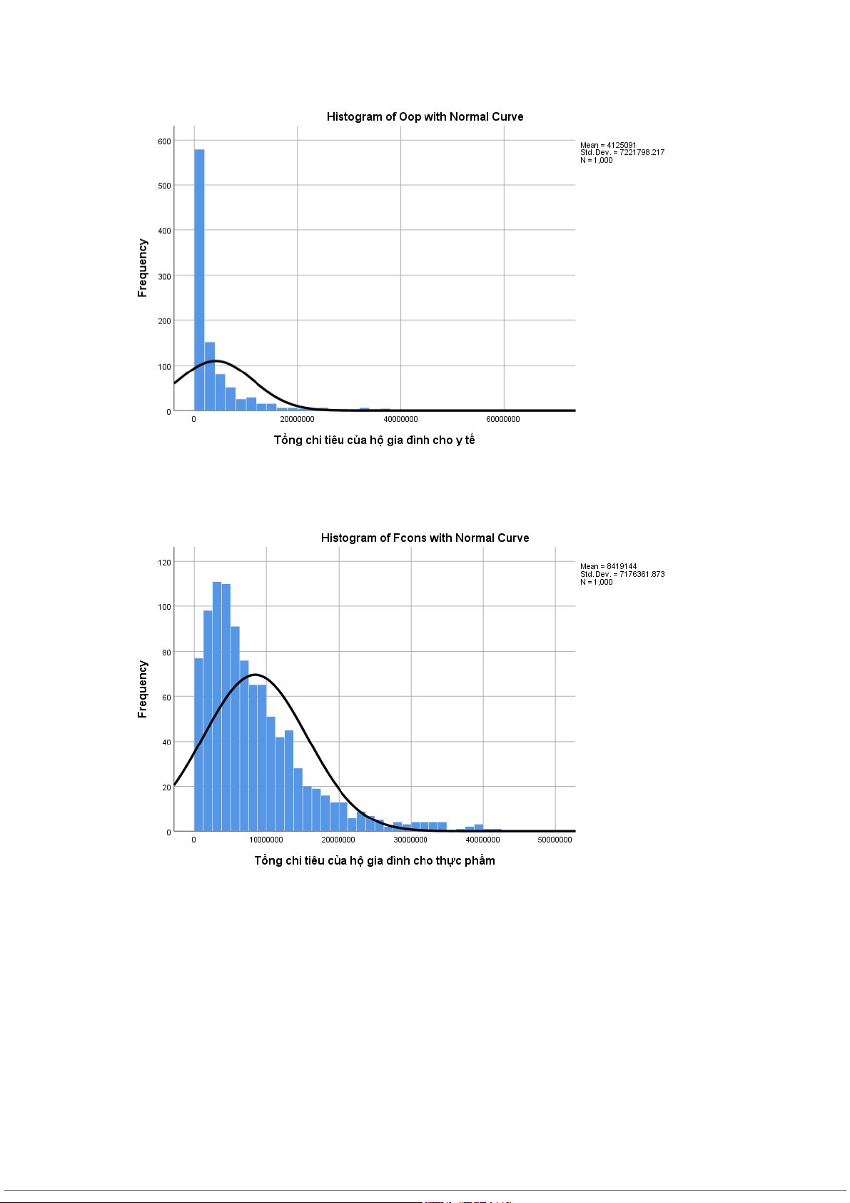 Tổng chi tiêu của hộ gia gia đình đình cho y tế đình cho thực phẩm N Valid 1000 1000 1000 Missing 0 0 0 Mean 97120234.5000 4125091.00 8419144.00 Std. Error of Mean 1974293.95380 228373.312 226936.488 Median 83866000.0000 1432000.00 6380000.00 Mode 43730000.00a 0 5010000a Std. Deviation 62432656.64698 7221798.217 7176361.873 Variance 3897836615999612.500 52154369494213.140 51500169728992.990 Skewness 1.345 3.702 1.699 Std. Error of Skewness .077 .077 .077 Kurtosis 2.600 17.607 3.474 Std. Error of Kurtosis .155 .155 .155 Range 418155500.00 63230000 41810000 Minimum 4205500.00 0 0 Maximum 422361000.00 63230000 41810000 Sum 97120234500.00 4125091000 8419144000 Percentiles 25 52019250.0000 500000.00 3342500.00 7