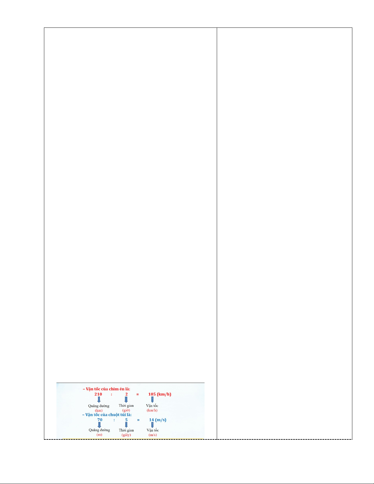 + Nhìn vào phép tính đầu tiên về chim én, 210 là gì? 2 là gì? 105 là gì? + Tương tự như vậy, một bạn nêu cho cô trong phép tính thứ 2 về chuột túi, 70 là gì? 5 là gì? 14 là gì? - GV: Ta nhận thấy được, đơn vị của vận tốc chính là đơn vị của quãng đường trên đơn vị thời gian. Các em lưu ý, đối với các sự vật có vận tốc lớn như máy bay, tên lửa,… ta dùng các đơn vị như km/h, m/s,… Còn đối với các sự vật có vận tốc nhỏ hơn như ốc sên, rùa bò,… ta có thể dùng các đơn vị như cm/phút, cm/s để đo chính xác hơn. - Muốn tính vận tốc của chuyển động ta làm như thế nào? - GV nhận xét, rút quy tắc - GV: Cô gọi quãng đường là s, thời gian là t, vận tốc là v, hãy nêu công thức tính vận tốc - GV nhận xét, tuyên dương và rút ra kết luận. KL: Muốn tính vận tốc ta lấy quãng đường chia cho thời gian. Gọi vận tốc là v, quãng đường là s, thời gian là t, ta có: v = s: t - Lưu ý: Khi viết các kí hiệu của vận tốc, quãng đường và thời gian, các em dùng cách viết thường, tránh viết in hoa gây nhầm lẫn với kí hiệu thể tích và diện tích đã học. | - HS xem video, kết hợp với tranh trong SGK và cùng nhau nêu tình huống: + Mai đọc sách về Thế giới động vật và chia sẻ 2 thông tin: Chim én bay được 210km trong 2 giờ; Chuột túi vừa chạy vừa nhảy được 70m trong 5 giây. + Rô-bốt cho biết: Muốn biết vật chuyển động nhanh hay chậm, ta cần tính vận tốc của chuyển động đó. + Việt thắc mắc: Muốn tính vận tốc ta làm thế nào nhỉ? - HS trả lời: Từ thông tin Mai chia sẻ, ta tính được quãng đường trung bình mỗi giờ chim én bay được, quãng đường trung bình mỗi giây chuột túi chạy được. - HS thảo luận nhóm - HS trả lời: + Trung bình mỗi giờ chim én bay được là: 210: 2= 105 (km) + Trung bình mỗi giây chuột túi chạy được là: 70: 5 = 14 (m) - HS lắng nghe - HS trả lời: + Trung bình quãng đường chim én bay được trong 1 giờ là 105km + Trung bình quãng đường chuột túi chạy được trong 1 giây là 14m. - HS lắng nghe - HS lắng nghe - HS trả lời: 210 là quãng đường chim én bay được; 2 là thời gian chim én bay hết quãng đường đó; 105 là vận tốc của chim én. - HS trả lời. - HS lắng nghe - Muốn tính vận tốc ta lấy quãng đường chia cho thời gian. - 2-4 em nhắc lại quy tắc. - HS nêu - HS lắng nghe và nhắc lại công thức. - HS lắng nghe và ghi nhớ | |||