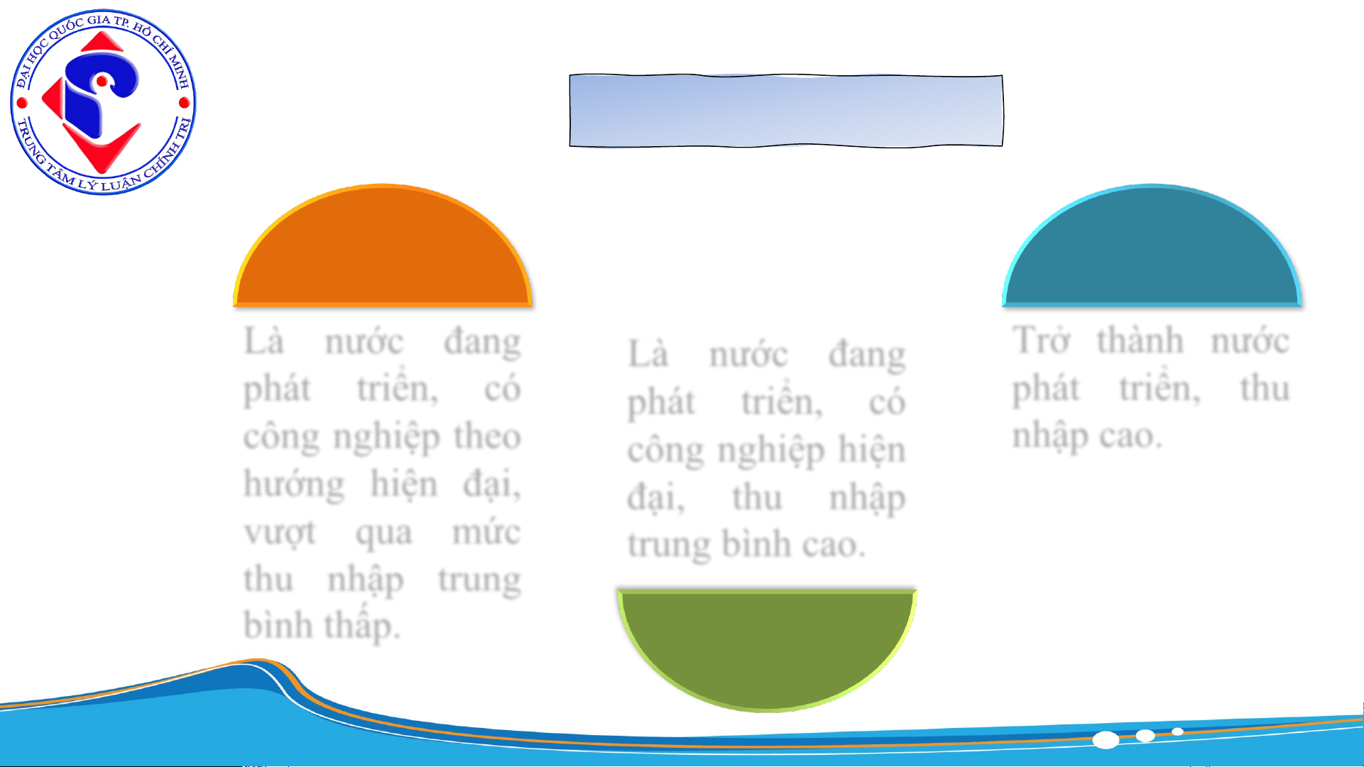 phát triển, theo hướng XHCN. Mục tiêu cụ thể 2025 2045 Là nước đang Trở thành nước Là nước đang phát triển, có phát triển, thu phát triển, có công nghiệp theo nhập cao. công nghiệp hiện hướng hiện đại, đại, thu nhập vượt qua mức trung bình cao. thu nhập trung bình thấp. 2030