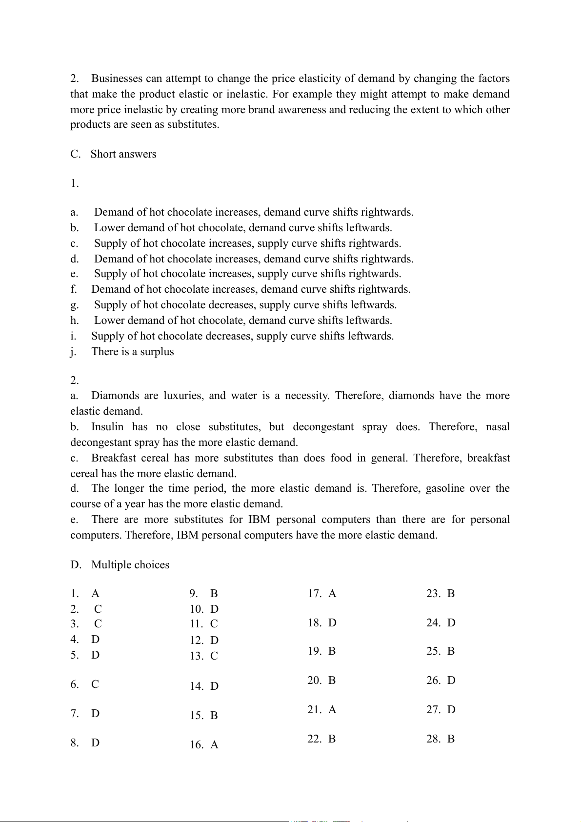 computers. Therefore, IBM personal computers have the more elastic demand. D. Multiple choices 1. A 9. B 17. A 23. B 2. C 10. D 3. C 11. C 18. D 24. D 4. D 12. D 5. D 13. C 19. B 25. B 6. C 14. D 20. B 26. D 7. D 15. B 21. A 27. D 8. D 16. A 22. B 28. B 29. C 32. A 35. C 39. Wrong 33. C 36. D question 30. D 37. D 40. C 31. A 34. A 38. C