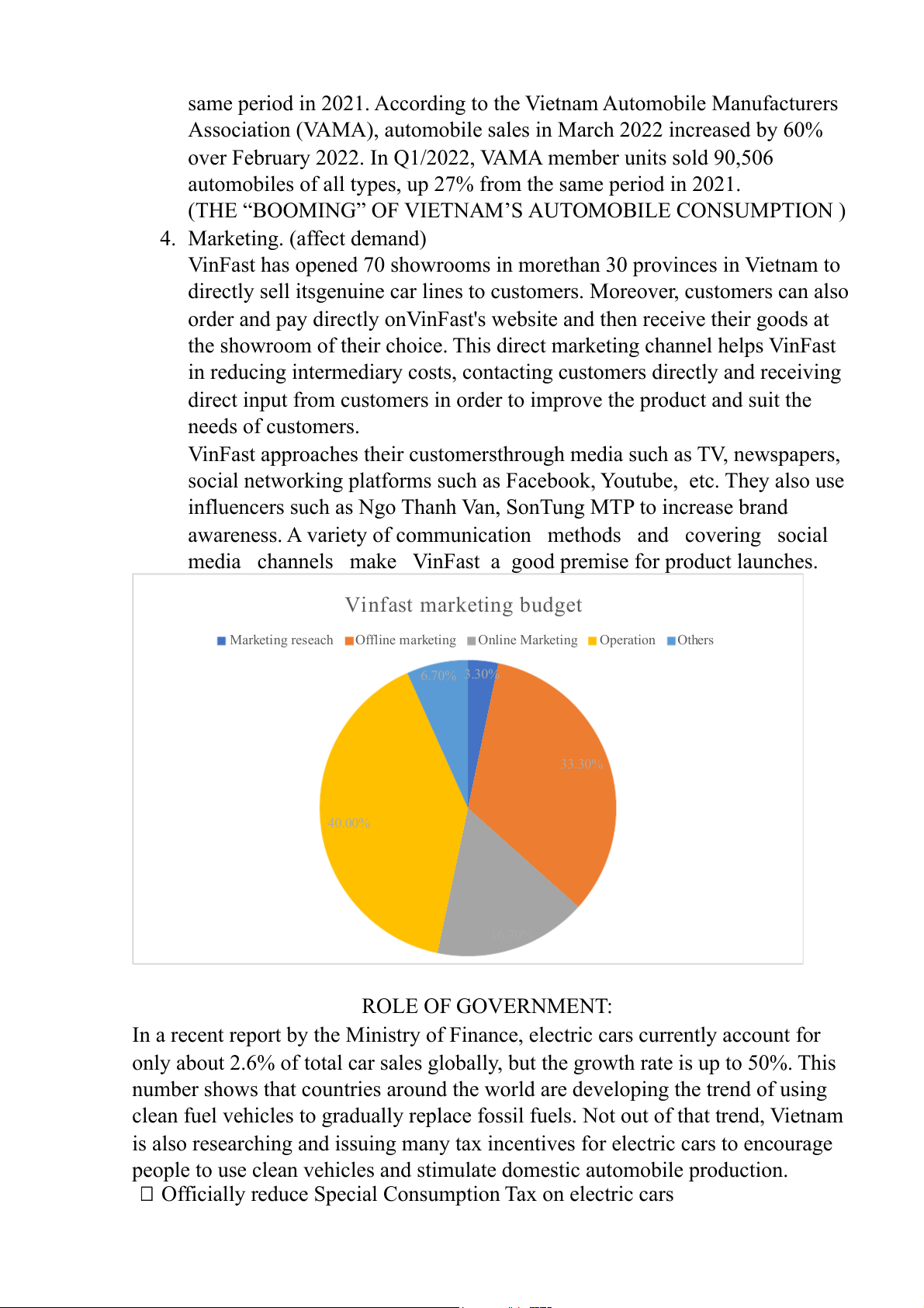media channels make VinFast a good premise for product launches. Vinfast marketing budget Marketing reseach Offline marketing Online Marketing Operation Others 6.70% 3.30% 33.30% 40.00% 16.70% ROLE OF GOVERNMENT: