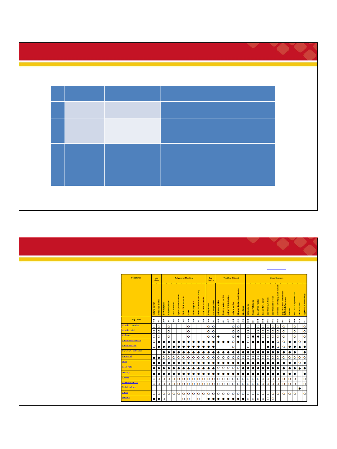 1.1.3. Phân loại theo tiêu chí sinh thái Nhóm nguyên Ký hiệu Ký hiệu Loại nguyên liệu Nhóm Loại nguyên liệu liệu (Mã) nguyên liệu (Mã) Da tự nhiên 100 Dây giầy cotton 500 Da thuộc Da phủ PU 101 Dây giầy PA hoặc PES 501 Vật liệu EVA 200 Dây giầy PES/cotton 502 Vật liệu cao su 201 Dây giầy PA/cotton 503 Vật liệu TPU 202 Xốp EVA cho lót giầy 504 Vật liệu Nylon/perax 203 Xốp cao su cho lót giầy 505 Polime (chất Vật liệu TPE/TPR 204 Phụ liệu