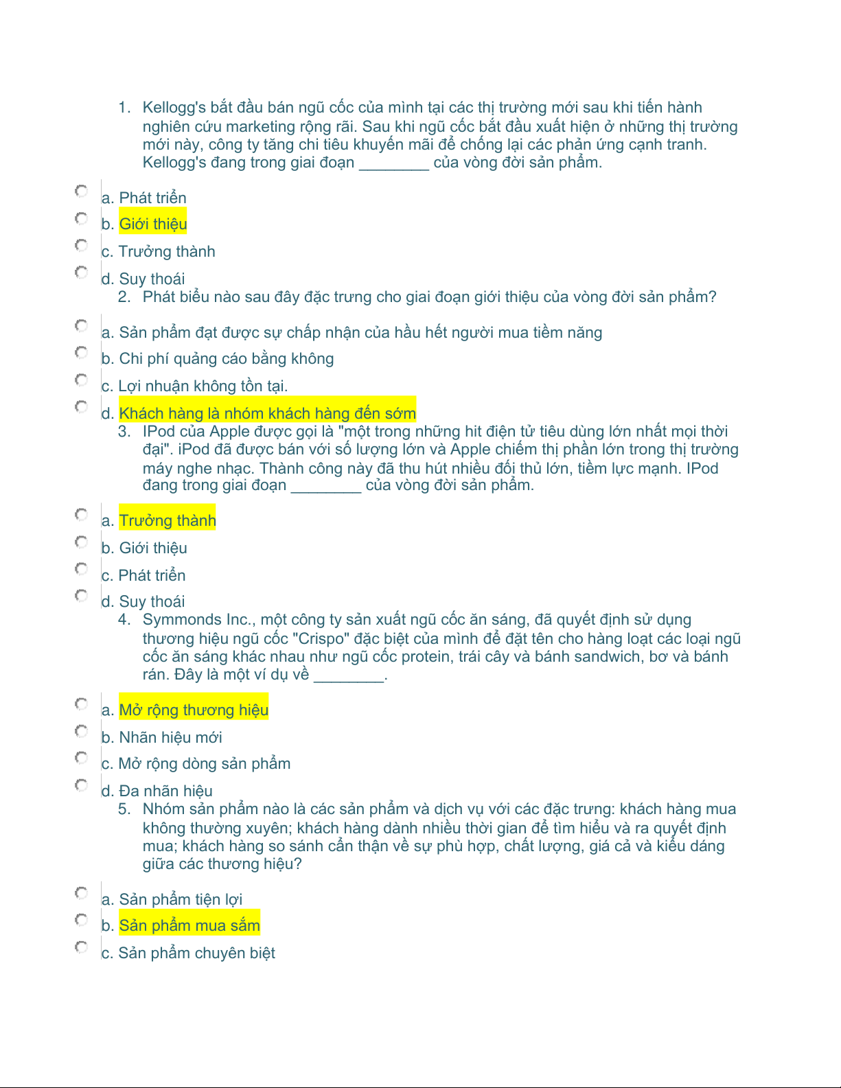 Kellogg's đang trong giai đoạn ________ của vòng đời sản phẩm. a. Phát triển b. Giới thiệu c. Trưởng thành d. Suy thoái
