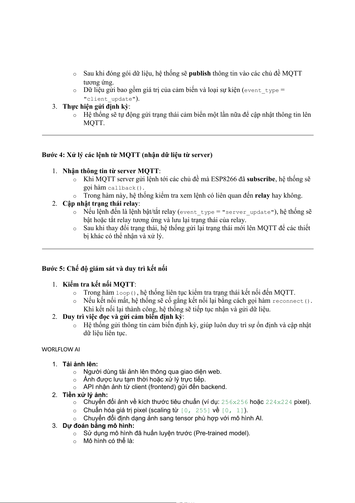 Hệ thống gửi thông tin cảm biến định kỳ, giúp luôn duy trì sự ổn định và cập nhật dữ liệu liên tục. WORLFLOW AI 1. Tải ảnh lên: o