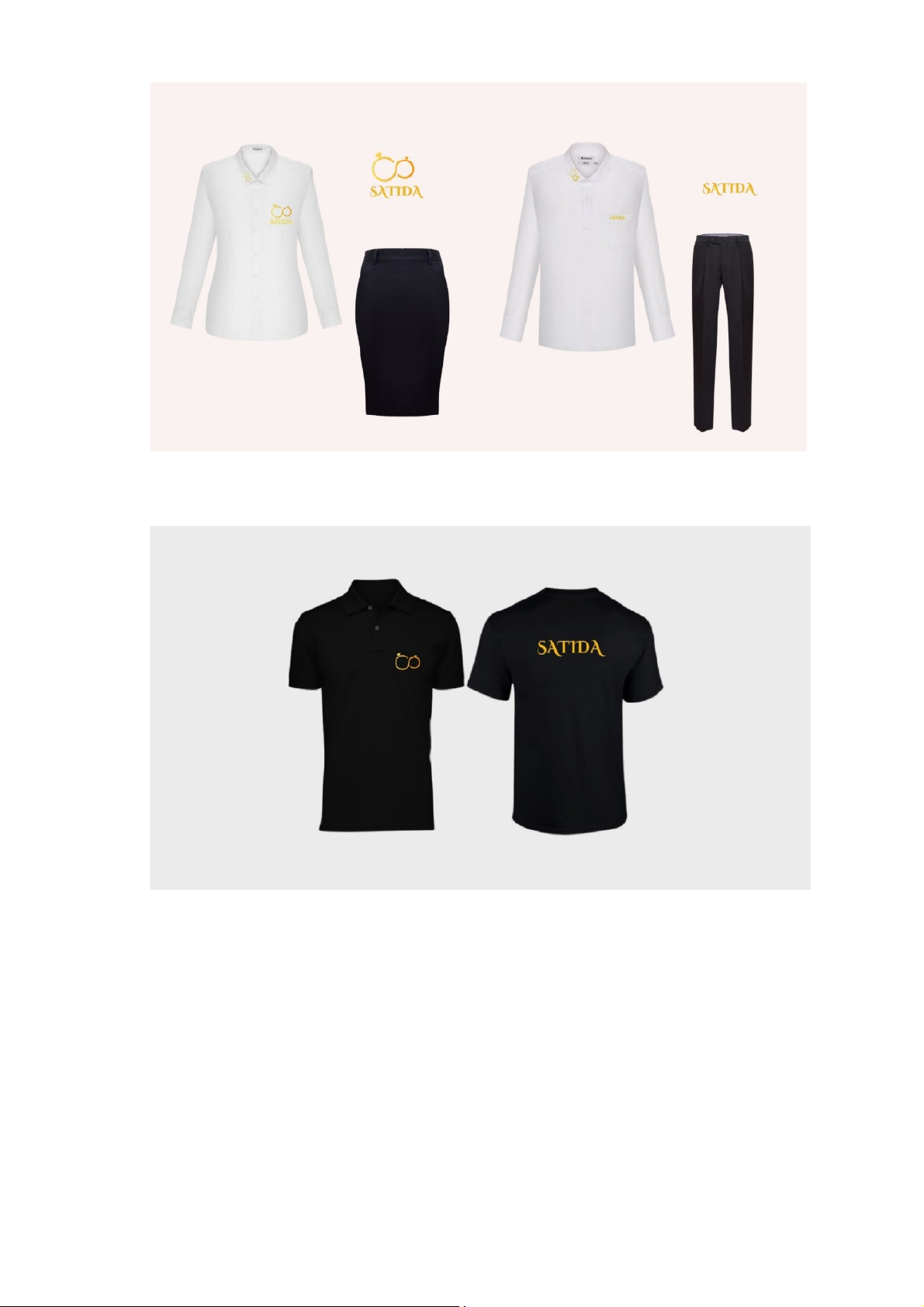 Đối với nữ: mặc áo sơ mi và chân váy đen, logo và tên thương hiệu được in ở bên ngực trái.