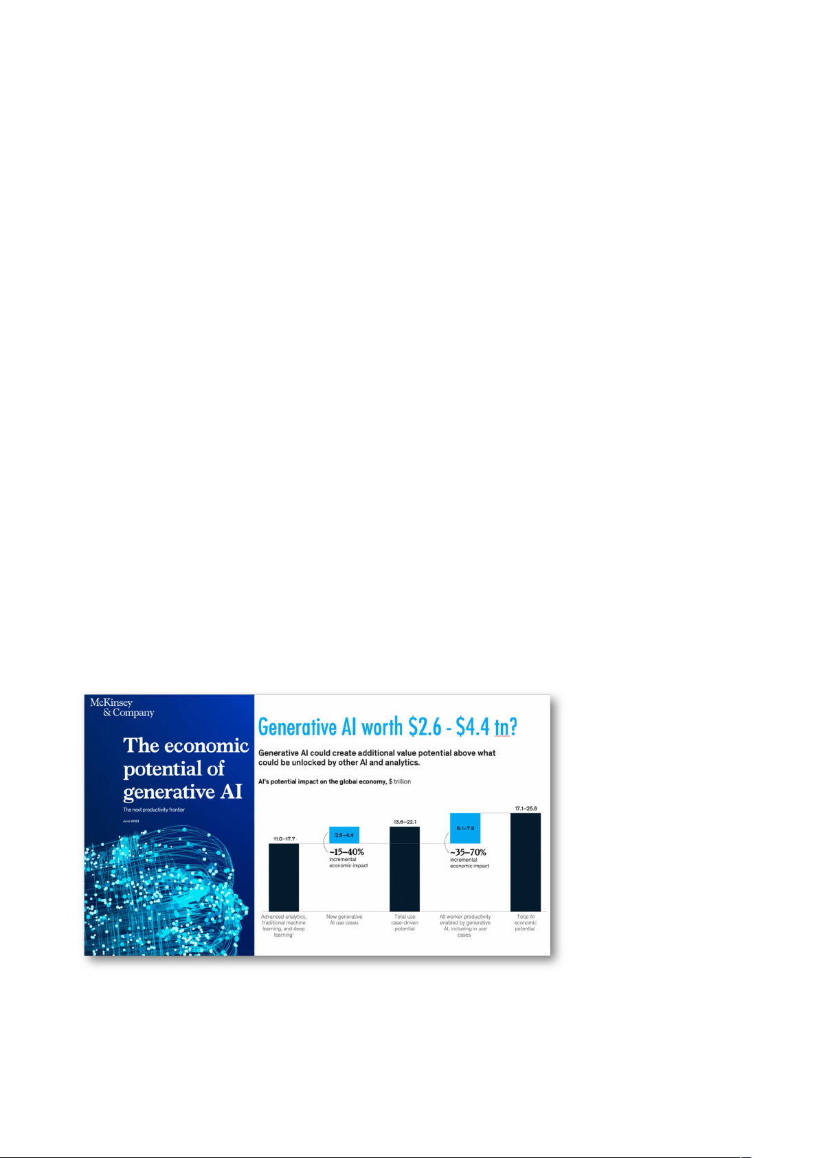 + Theo McKinsey (2024), việc ứng dụng AI có thể tăng thêm 4,4 nghìn tỷ USD vào GDP toàn cầu mỗi năm.