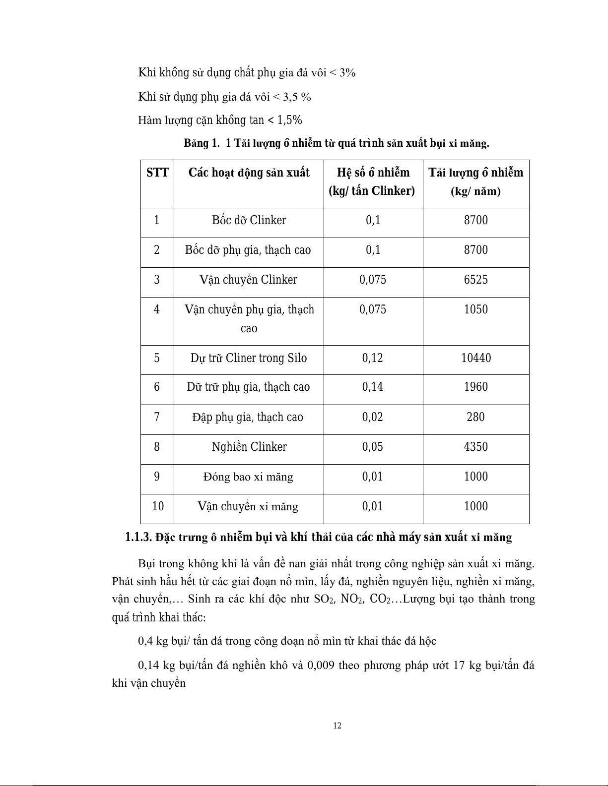 Bảng 1. 1 Tải lượng ô nhiễm từ quá trình sản xuất bụi xi măng. . . . . . . . . . . . . . 12