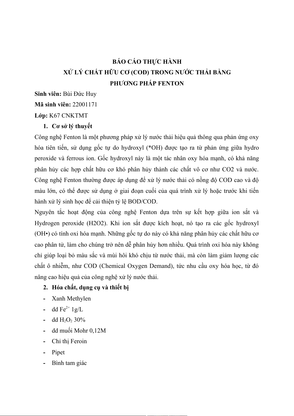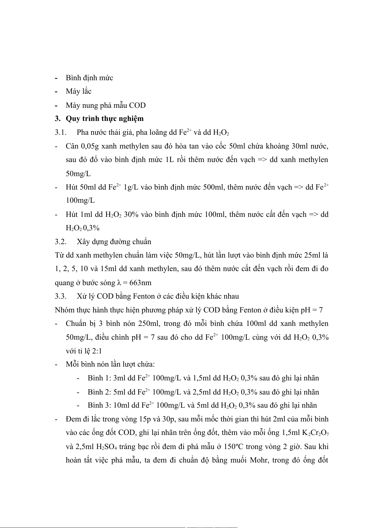 2. Hóa chất, dụng cụ và thiết bị - Xanh Methylen - dd Fe2+ 1g/L - dd H2O2 30% - dd muối Mohr 0,12M - Chỉ thị Feroin - Pipet - Bình tam giác - Bình định mức - Máy lắc