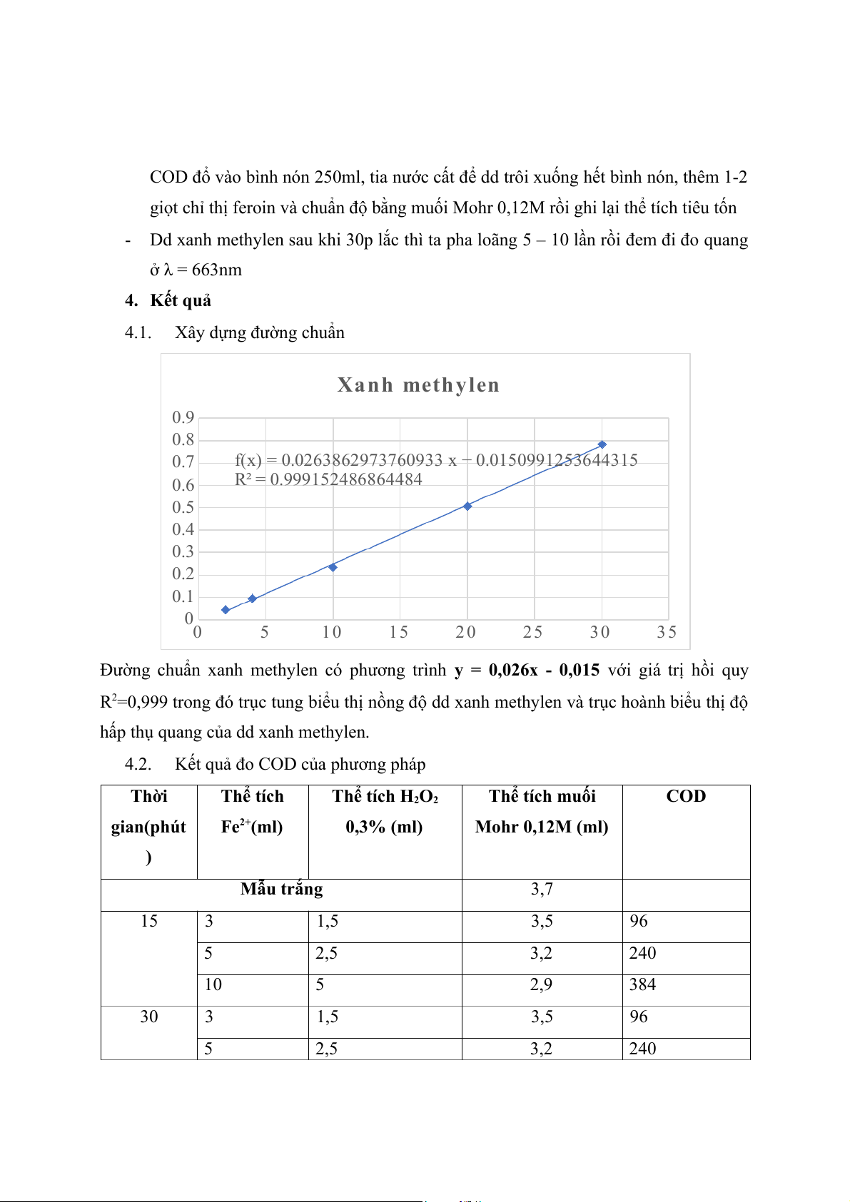 Kết quả đo COD của phương pháp Thời Thể tích Thể tích H2O2 Thể tích muối COD gian(phút Fe2+(ml) 0,3% (ml) Mohr 0,12M (ml) ) Mẫu trắng 3,7 15 3 1,5 3,5 96 5 2,5 3,2 240 10 5 2,9 384 30 3 1,5 3,5 96 5 2,5 3,2 240 10 5 3,1 288 4.3.