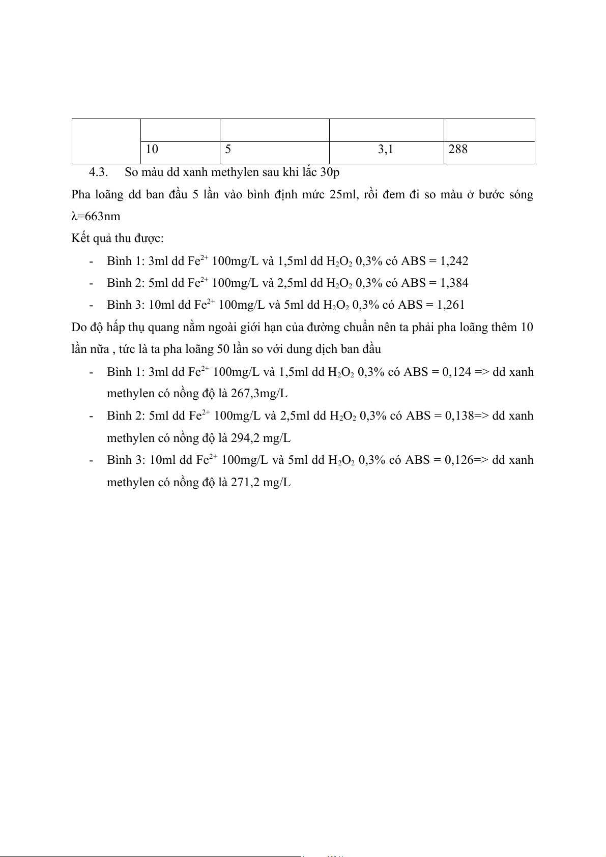 - Bình 1: 3ml dd Fe2+ 100mg/L và 1,5ml dd H2O2 0,3% có ABS = 1,242