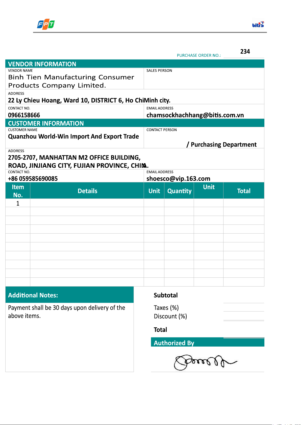 Win Import And Export Trade Co., Ltd. Biti’s đã làm một bảng báo giá và phản hồi