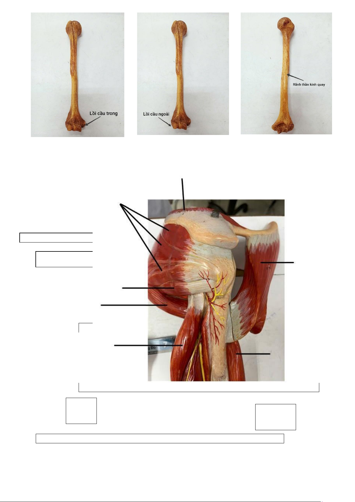 3. Xác định cơ củ lớn, củ bé, rãnh gian củ, lồi cầu trong, lồi cầu ngoài, rãnh thần kinh quay ( trên mô hình ) Cơ thang Cơ dưới gai Cơ ngực lớn Cơ tam Cơ tròn bé đầu Cơ nhị đầu (đầu dài ) Cơ tròn lớn lOMoAR cPSD| 47207194 lOMoAR cPSD| 47207194 Cơ tam đ ầ u ( đ ầ u dài ) Cơ nh ị đ ầ u TK quay ( đ ầ u dài ) Cơ cánh tay Cơ tam đ ầ u ( đ ầ u trong ) Cơ cánh tay quay TK quay Cơ du ỗ i các ngón Cơ g ấ p c ổ tay tr ụ Cơ du ỗ i ngón út Cơ du ỗ i c ổ tay tr ụ lOMoAR cPSD| 47207194