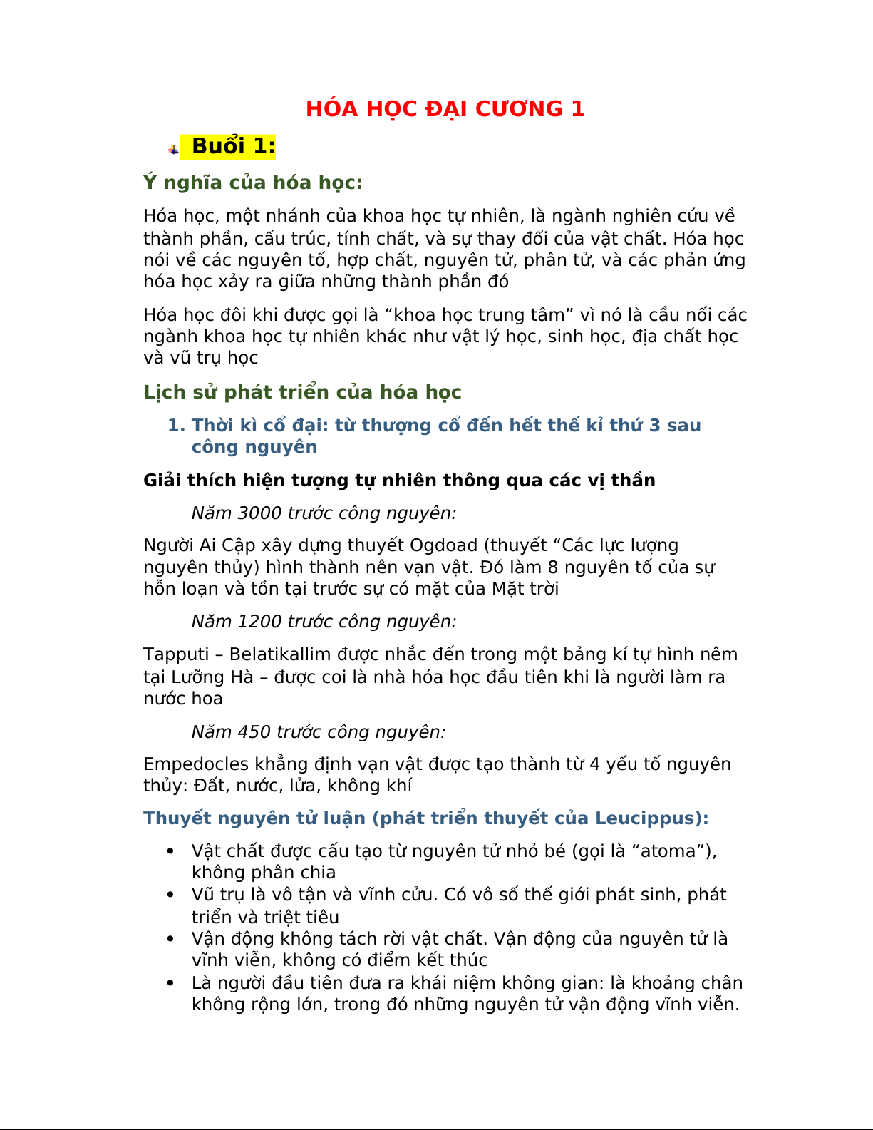 HÓA HỌC ĐẠI CƯƠNG 1 Buổi 1: Ý nghĩa của hóa học: