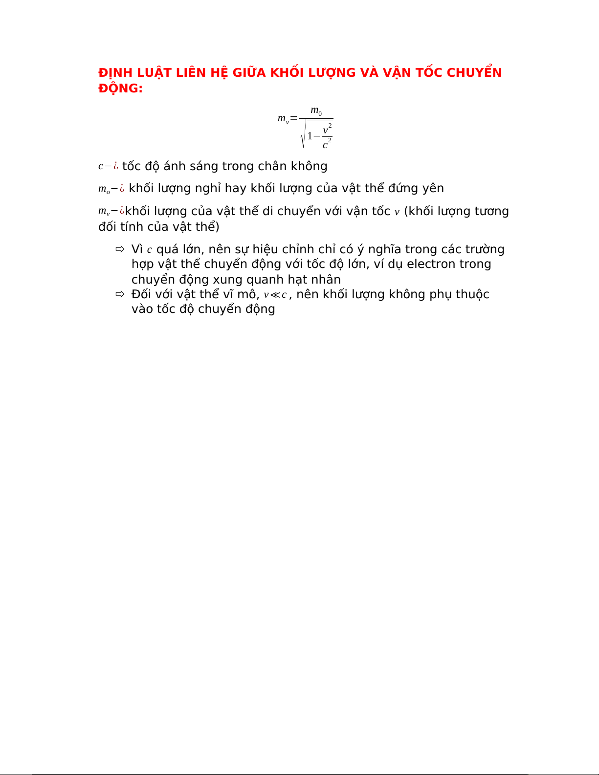 m −¿ khối lượng nghỉ hay khối lượng của vật thể đứng yên o