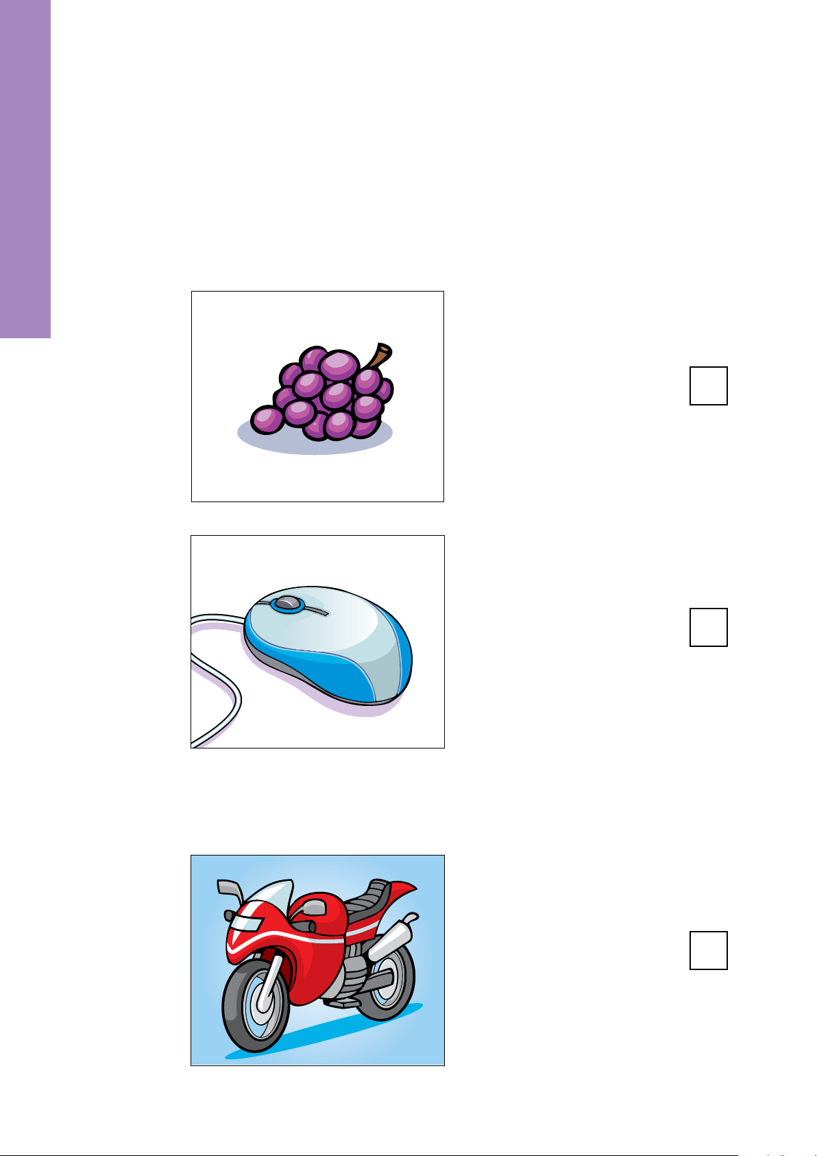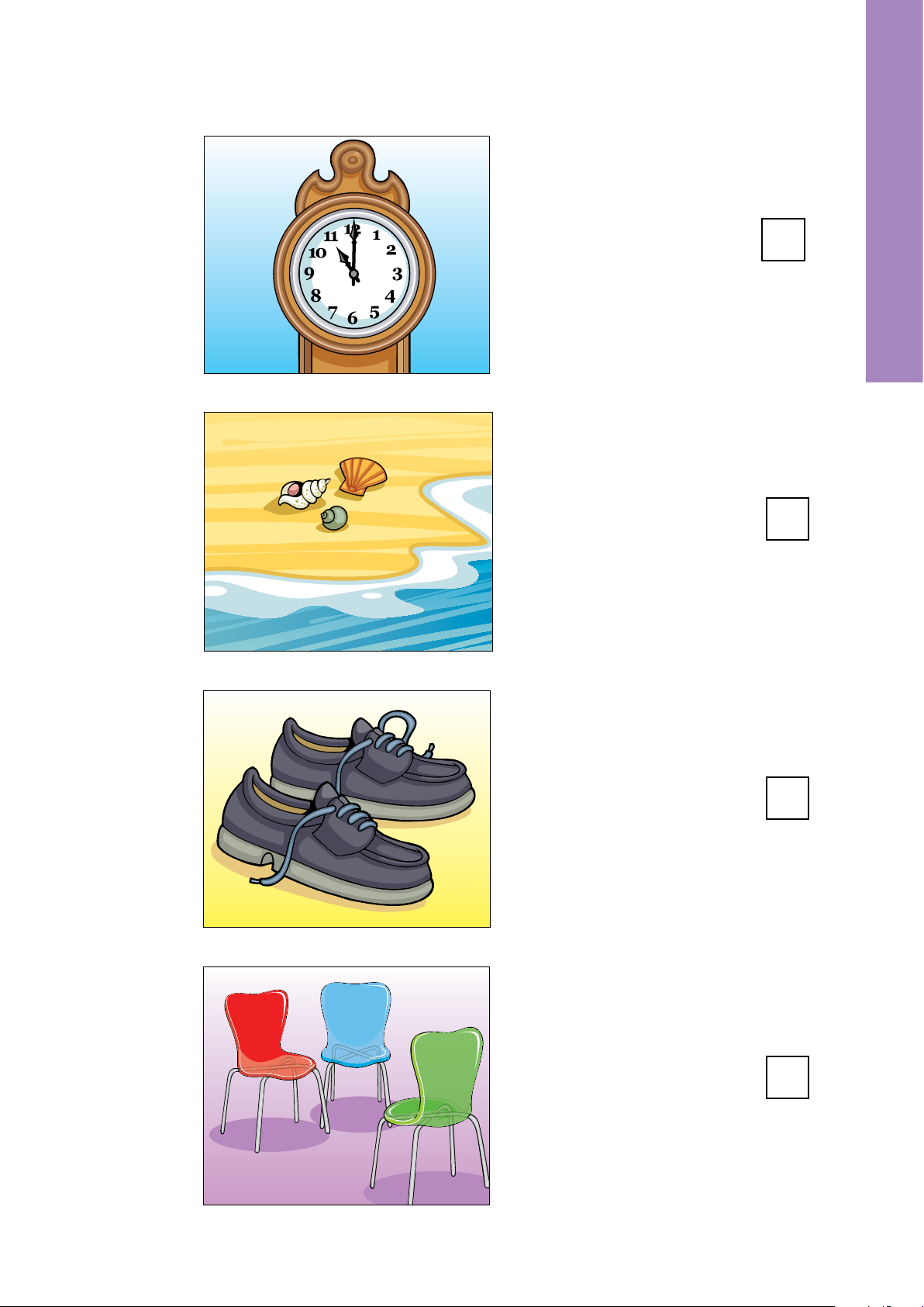 Look and read. Put a tick (✔) or a cross (✘) in the box. There are two examples. and W riting Examples These are grapes. ✔ This is a house. ✘ Questions 1 This is a helicopter. 16 Cambridge Assessment English 2 riting and W 2 Reading s This is a clock. Starter e A1 Pr 3 These are shells. 4 This is a sock. 5 These are chairs. Pre A1 Starters 17 3 Pr e A1 Starter Part 2 s – 5 questions – Reading