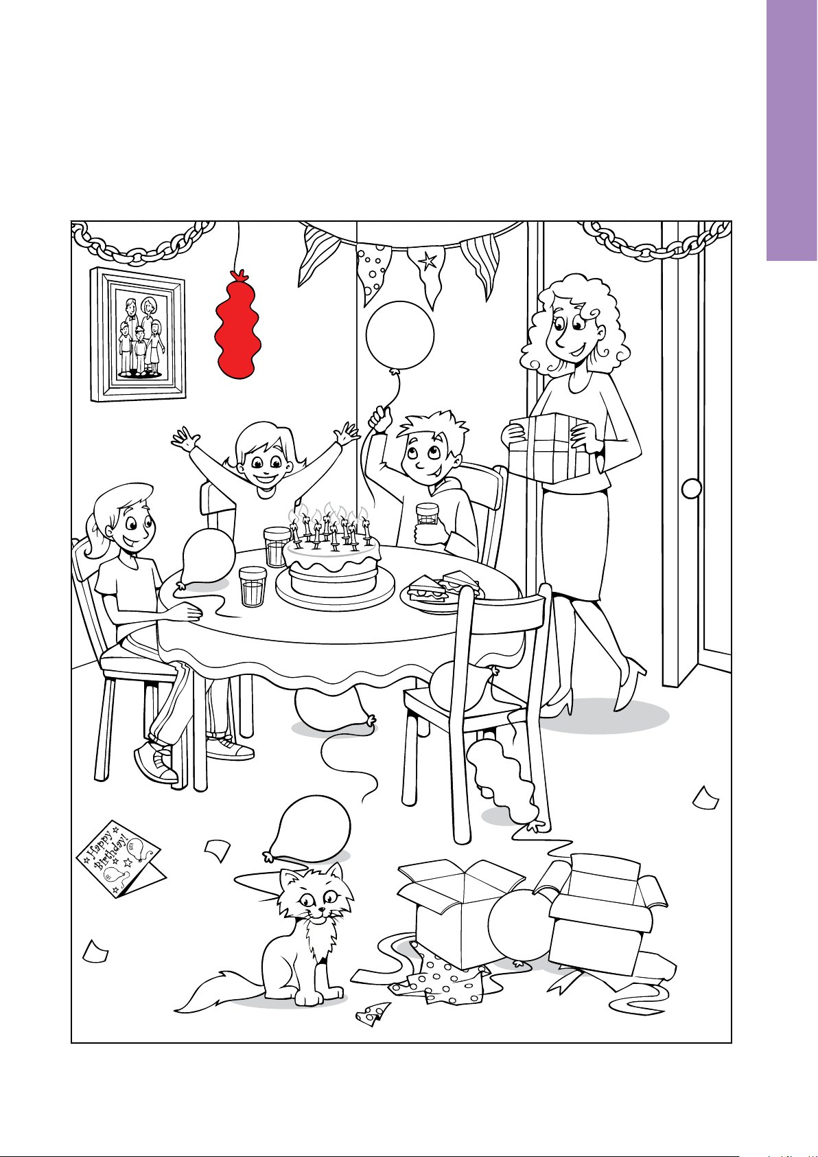 OK! I’m colouring that balloon, the one on the chair, now. Look at the picture. M Great! Listen and look. PAUSE 00’15” There is one example. R Five PAUSE 00’03” Fch